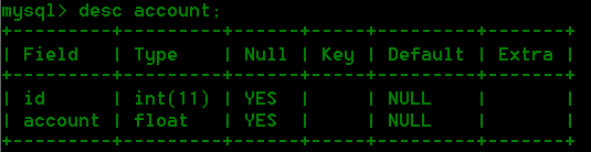 首先创建一个表 account。创建表的过程略过(由于 InnoDB 存储引擎支持事务,所以将表的存储引擎设置为 InnoDB)。表的结构如下: