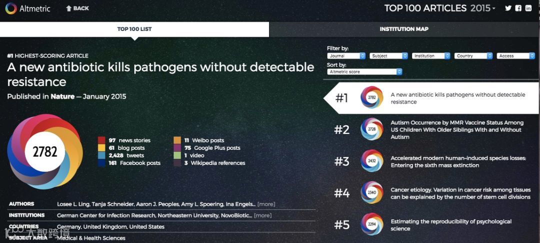 Altmetric 有些数据是需要付费的,但它们还提供每年发布的最具热度的前 100 篇文章,这非常有用。