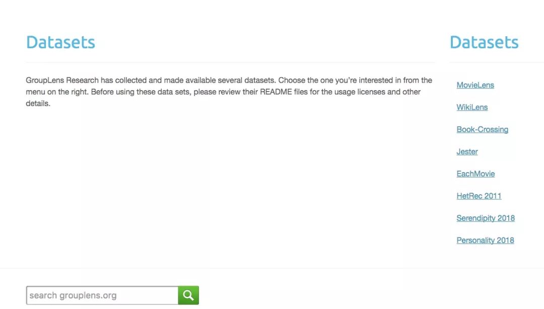 Group Lens 上有几个可用的数据集,这些数据集对特定的项目很有用。一些数据集已有十多年的历史。你可以在这里得到很多关于书籍和电影的信息。