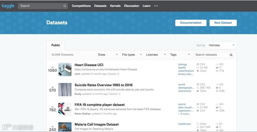 Kaggle 目前有将近 16,000 个数据集。你可以找到从运动队球员统计到洛杉矶停车引语任何范畴的数据。