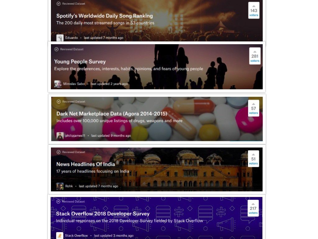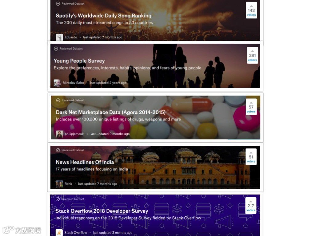 大约有300个竞赛挑战,全部附带公共数据集,总共9500多个数据集(并且不断增加)这个地方就像是数据科学/机器学习项目的创意宝库。