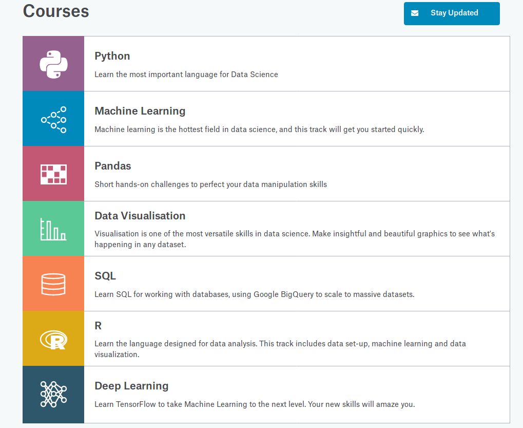 此选项卡包含免费且实用的实践课程, 这些课程涵盖了快速入门所需的最低前置课程。他们最好的地方是什么?——一切都是使用Kaggle的内核完成的(如上所述)。这意味着您可以互动和学习……通过数小时的学习材料不再被动阅读!