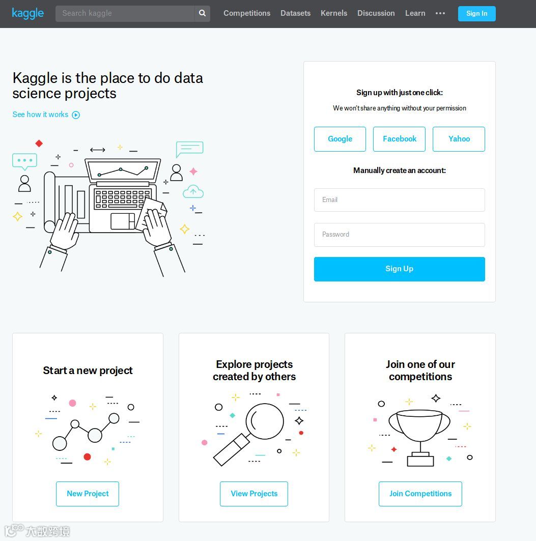 这是对“Kaggle是什么”的不完整描述!我认为竞赛(以及它们丰厚的现金奖励)并不是Kaggle的真谛。看看他们网站的标题——
