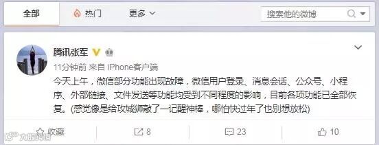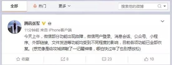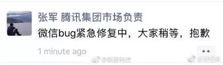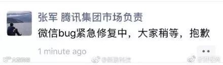 腾讯公关总监张军随即在微信朋友圈称,“微信bug紧急修复中,大家稍等,抱歉”。