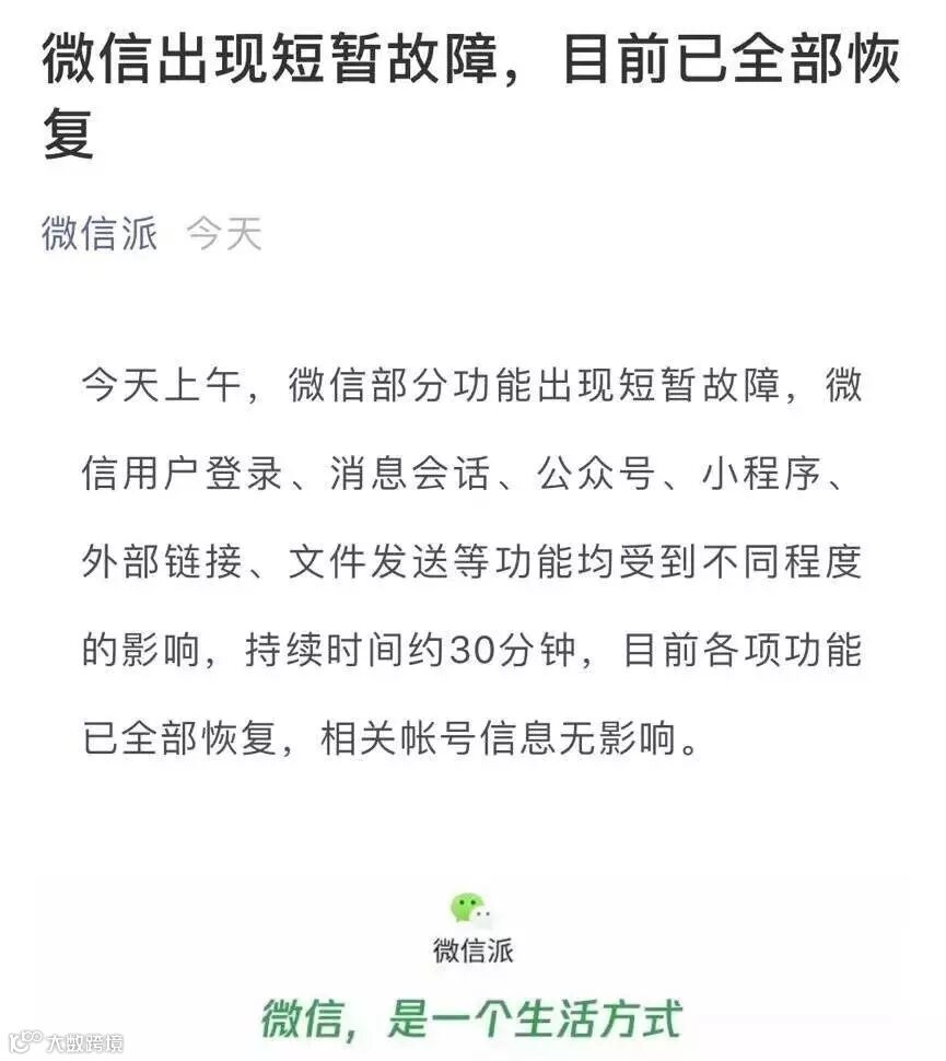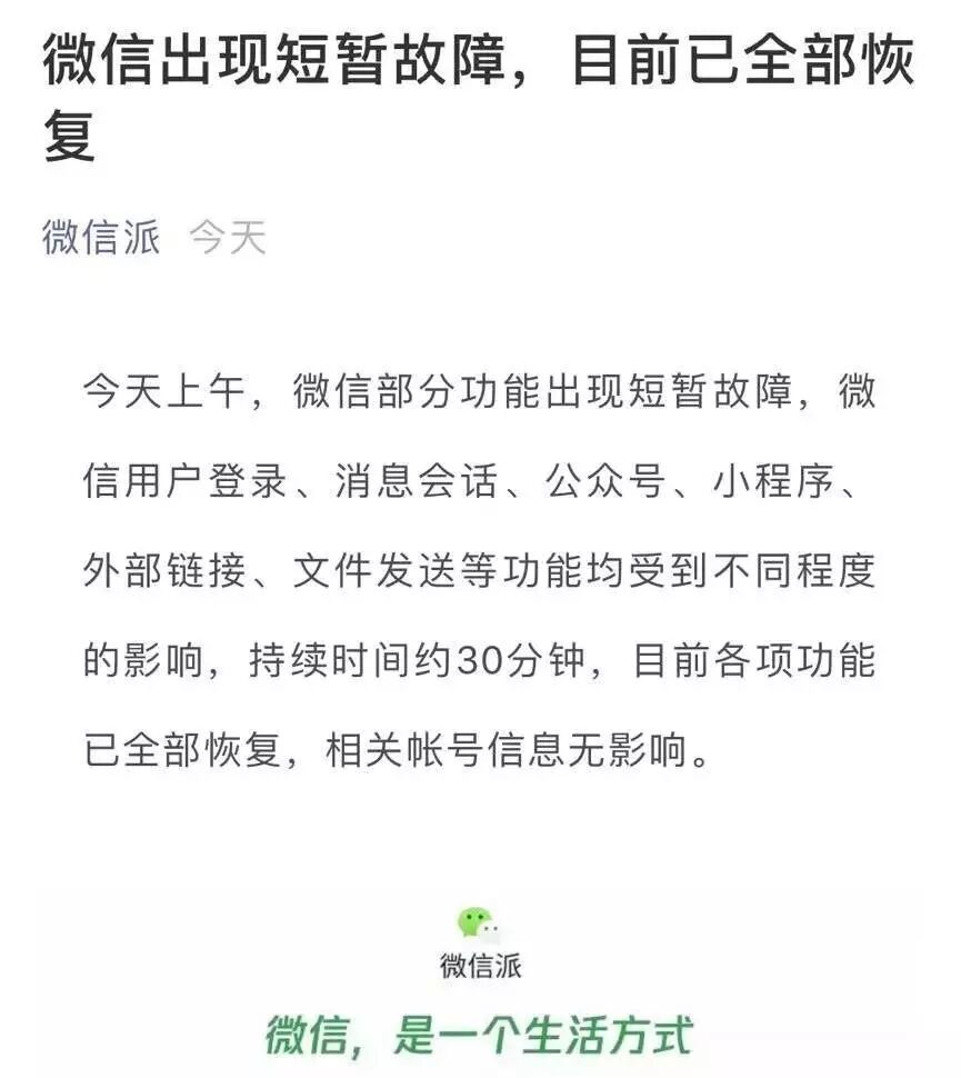 是程序员误删了代码?还是被黑客攻击了?截止到目前,仍然无法确知是什么原因导致了微信此次出现大面积异常。在微信派的文章里称,故障持续时间约30分钟。