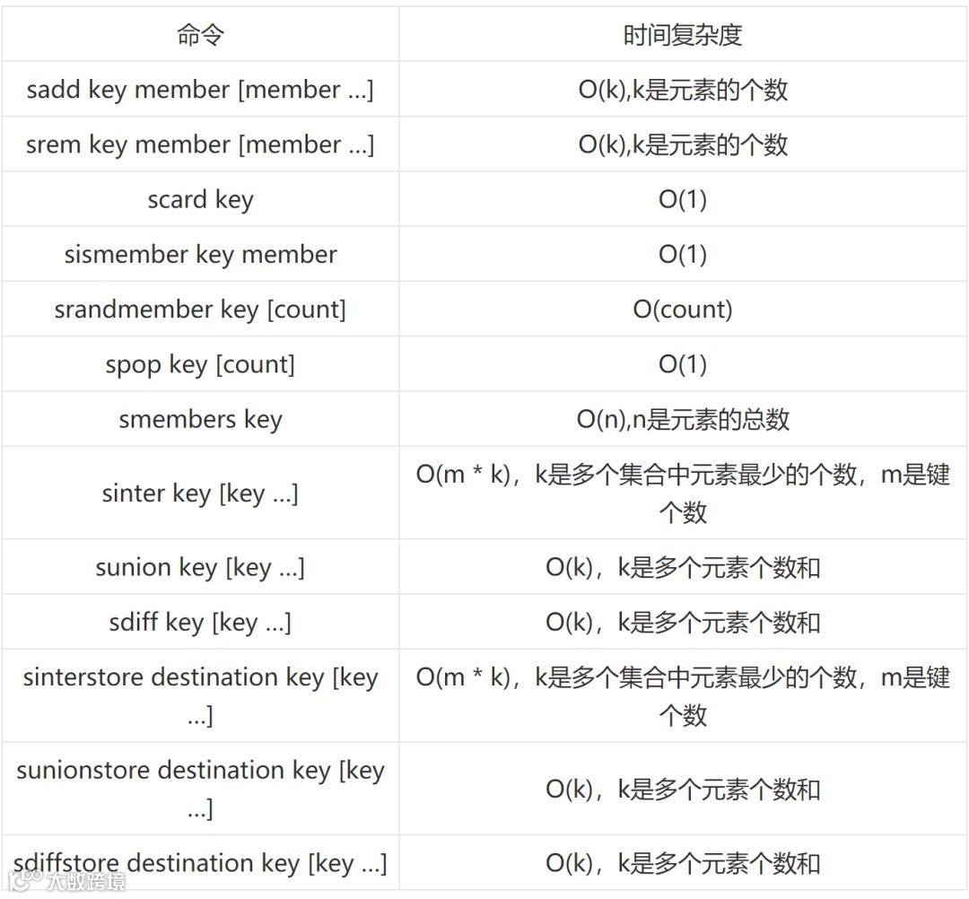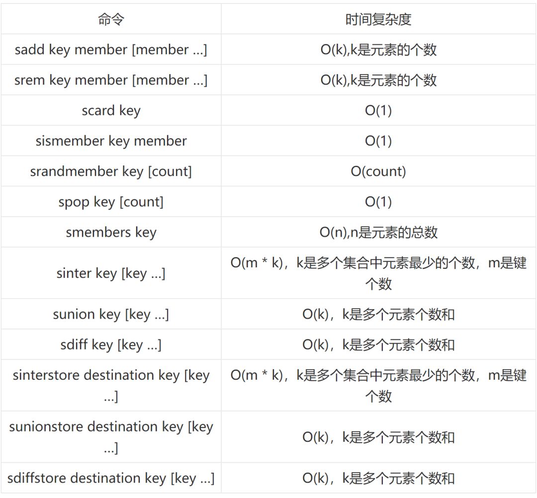 下面我们看一下 set 中相关命令的时间复杂度。