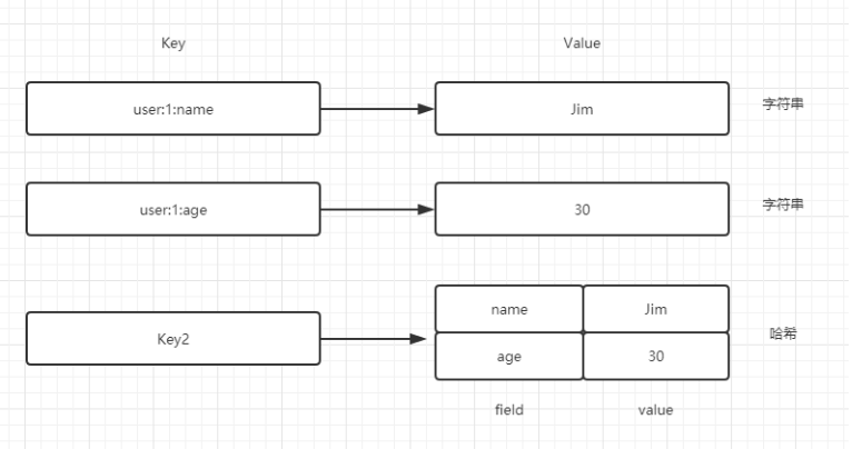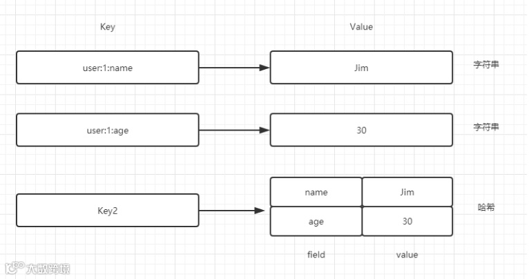 通过下图可以直观感受一下字符串类型和哈希类型的区别: