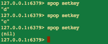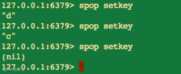 spop 命令也是随机从 set 中弹出元素,并且也支持 count 可选参数,但有一点和 srandmember 命令不同。spop 命令在随机弹出元素之后,会将弹出的元素从 set 中删除。