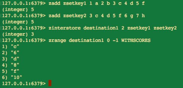 zinterstore destination numkeys key [key ...] [WEIGHTS weight] [AGGREGATE SUM|MIN|MAX]