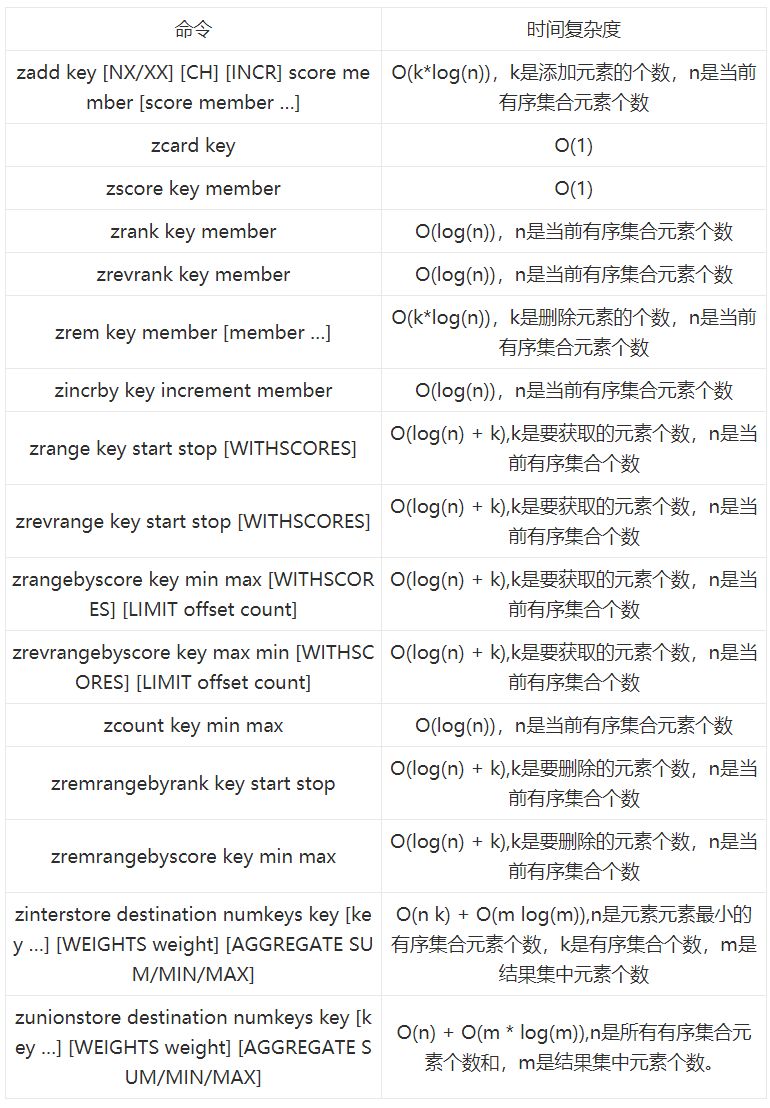 备注:由于有序集合相比集合提供了排序字段,正是因为如此也付出了相应的代价,sadd 的时间复杂度为 O(1),而 zadd 的时间复杂度为O(log(n))。