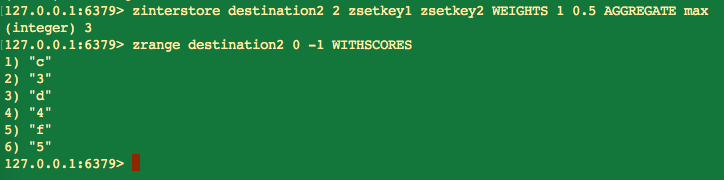 下面我们将权重设置为 0.5,这样当计算交集后,有序集合中的元素分数将都会减半,并且使用 max 参数汇总。
