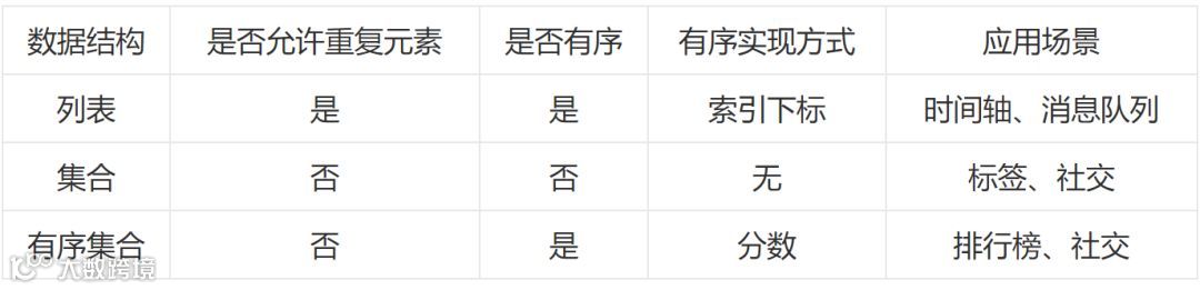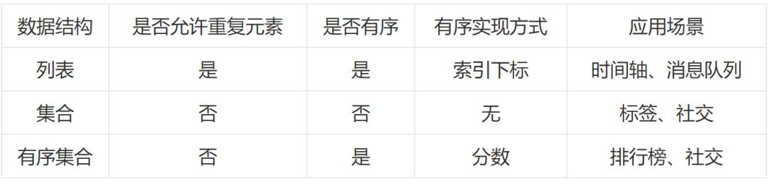 下面先看一下列表、集合、有序集合三种数据类型之间的区别: