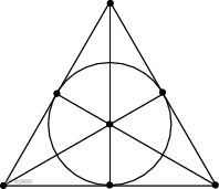 有一种几何方法,可以非常简单地做到这一点。七个号码就是七个点,把它们用直线连起来,每根线上只能有三个点,而每个点出现在三根线上。画成上面的形状,就得到了七根线(内部的圆也算一根线)。然后,记录一下每根线上的号码,很简单就选出了七张彩票。