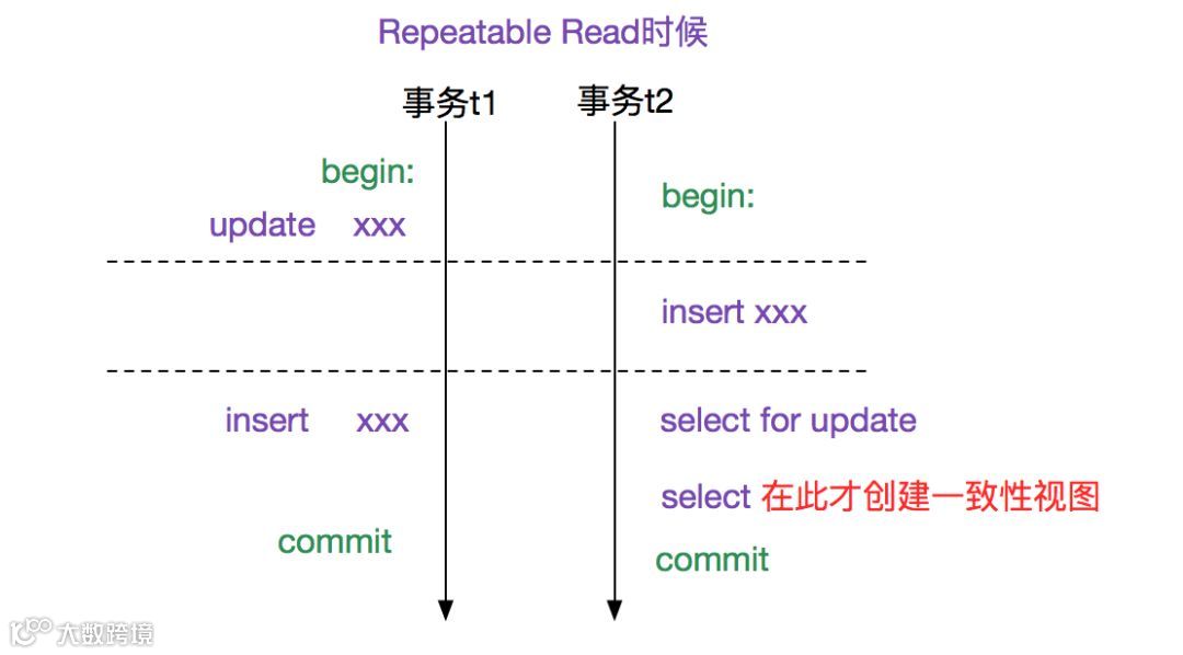 所以综合这两段代码,即在一个事务中,只有第一次运行select(不加锁)的时候才会创建一致性视图,如下图所示: