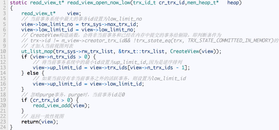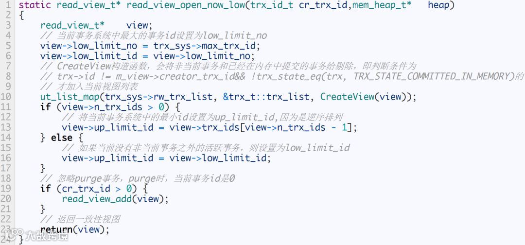 上面的注释就是select for update(in share model)不会走MVCC的原因。让我们进一步分析trx_assign_read_view函数: