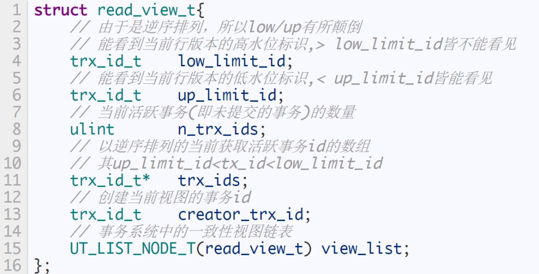 我们先关注一致性视图的创建过程,我们先看下read_view结构:
