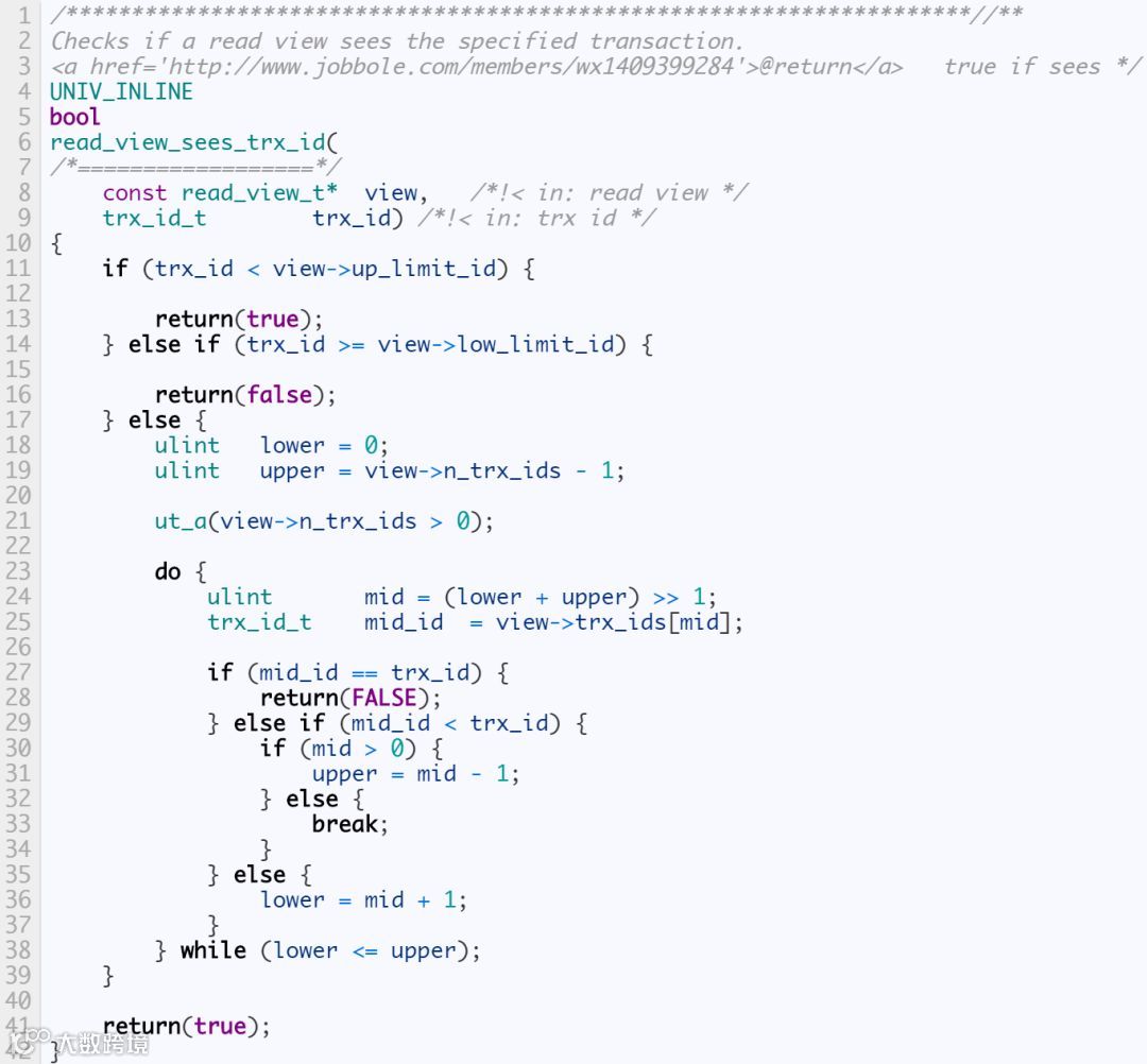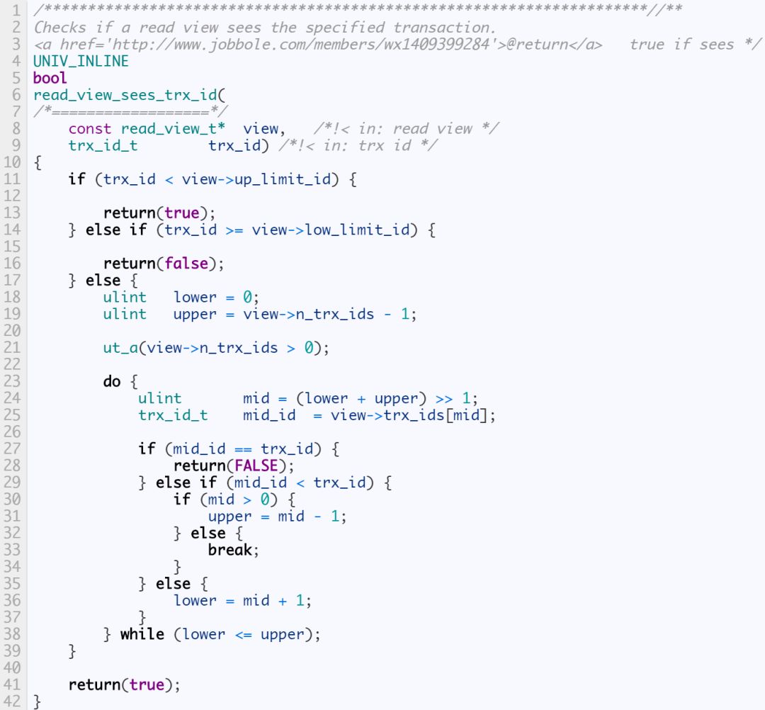 由上面的lock_clust_rec_cons_read_sees可知,行版本可见性由read_view_sees_trx_id函数判断:
