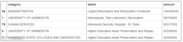 之前的文章(http://pbpython.com/web-scraping-mn-budget.html)描述了我们要处理的数据,我从每一类中抽取了更深一层的样例,并选用了更详细的元素。这份数据集包含了125行,但是为了保持简洁,我只选用了前10行,完整的数据集可以在这里(http://pbpython.com/extras/mn-budget-detail-2014.csv)找到。
