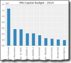 bar.title("MN Capital Budget - 2014").xlabel("Detail").ylabel("Amount")