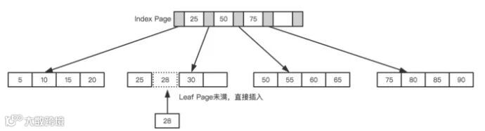 仍以上面的树为例,我们假设每个节点只能存储4个内节点。首先要插入第一个节点28,如下图所示。