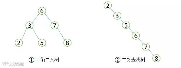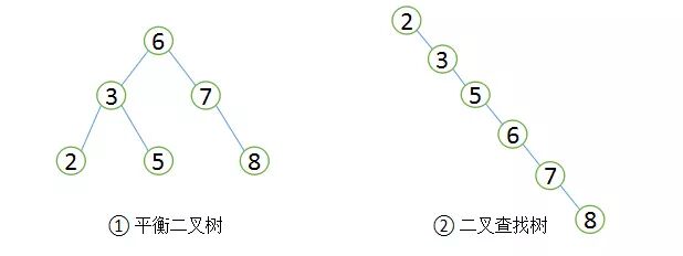 由于二叉查找树可以任意构造,同样的值,可以构造出如图②的二叉查找树,显然这棵二叉树的查询效率和顺序查找差不多。若想二叉查找数的查询性能最高,需要这棵二叉查找树是平衡的,也即平衡二叉树(AVL树)。