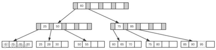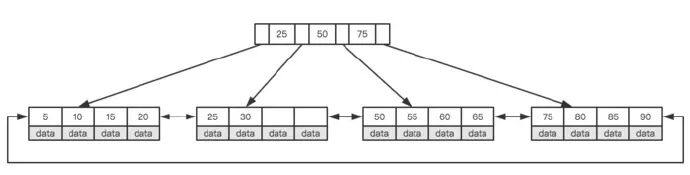 一种行之有效的解决方法是减少树的深度,将二叉树变为m叉树(多路搜索树),而B+Tree就是一种多路搜索树。理解B+Tree时,只需要理解其最重要的两个特征即可:第一,所有的关键字(可以理解为数据)都存储在叶子节点(Leaf Page),非叶子节点(Index Page)并不存储真正的数据,所有记录节点都是按键值大小顺序存放在同一层叶子节点上。其次,所有的叶子节点由指针连接。如下图为高度为2的简化了的B+Tree。