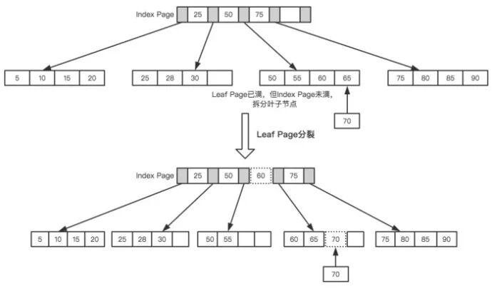 接着插入下一个节点70,在Index Page中查询后得知应该插入到50 – 70之间的叶子节点,但叶子节点已满,这时候就需要进行也分裂的操作,当前的叶子节点起点为50,所以根据中间值来拆分叶子节点,如下图所示。
