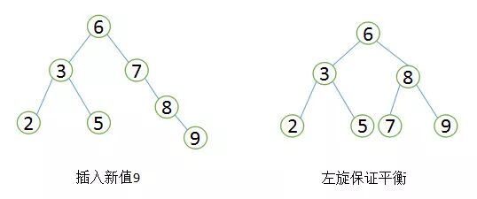 平衡二叉树首先需要符合二叉查找树的定义,其次必须满足任何节点的两个子树的高度差不能大于1。显然图②不满足平衡二叉树的定义,而图①是一课平衡二叉树。平衡二叉树的查找性能是比较高的(性能最好的是最优二叉树),查询性能越好,维护的成本就越大。比如图①的平衡二叉树,当用户需要插入一个新的值9的节点时,就需要做出如下变动。