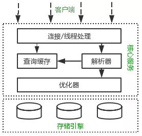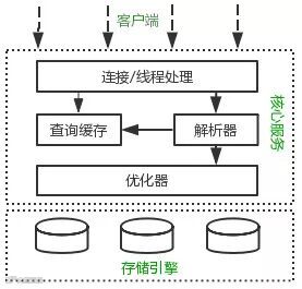 最下层为存储引擎,其负责MySQL中的数据存储和提取。和Linux下的文件系统类似,每种存储引擎都有其优势和劣势。中间的服务层通过API与存储引擎通信,这些API接口屏蔽了不同存储引擎间的差异。