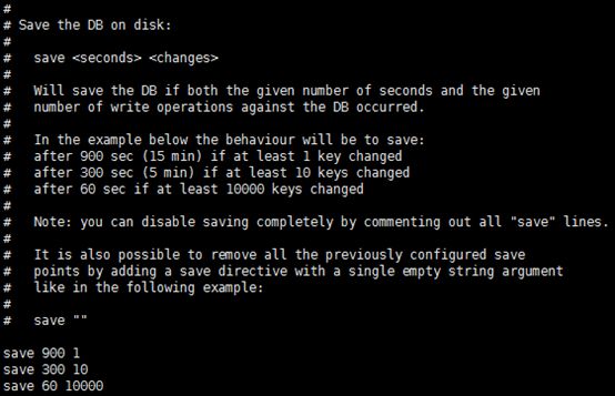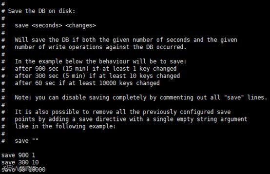 其中save 900 1的含义是:当时间到900秒时,如果redis数据发生了至少1次变化,则执行bgsave;save 300 10和save 60 10000同理。当三个save条件满足任意一个时,都会引起bgsave的调用。