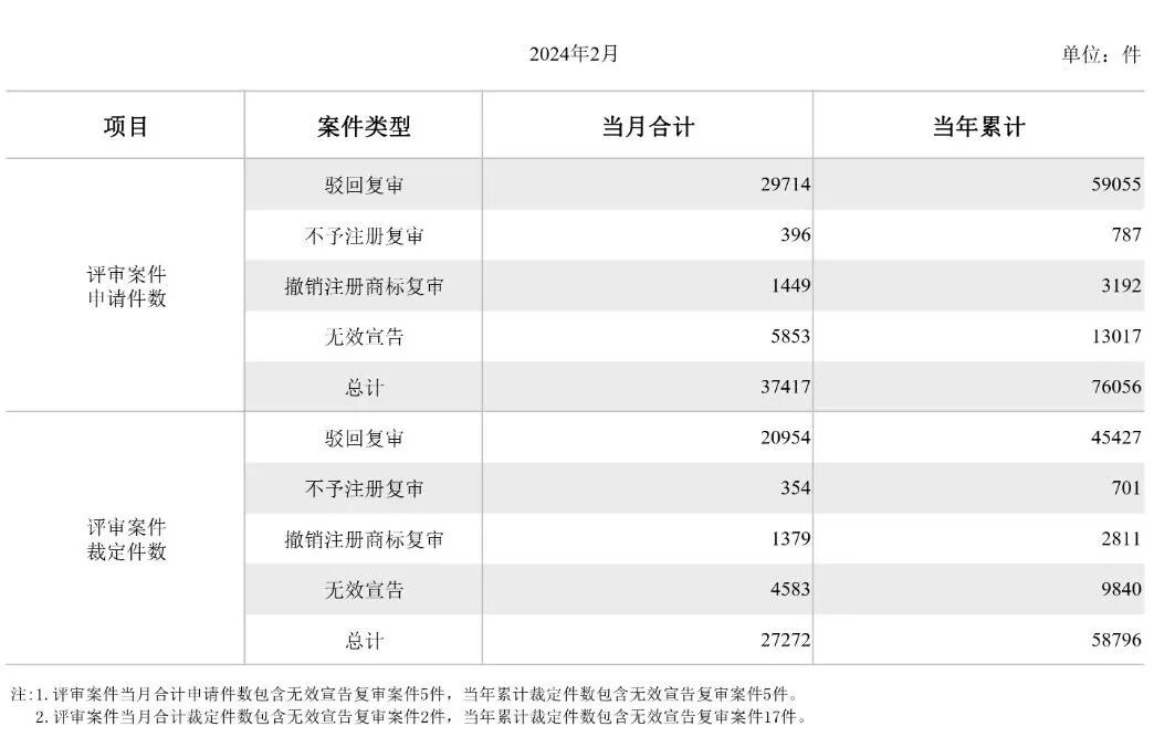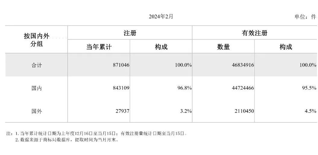 近日,《2024年2月国家知识产权局审查注册登记统计月报》对外公布,商标数据统计情况如下: