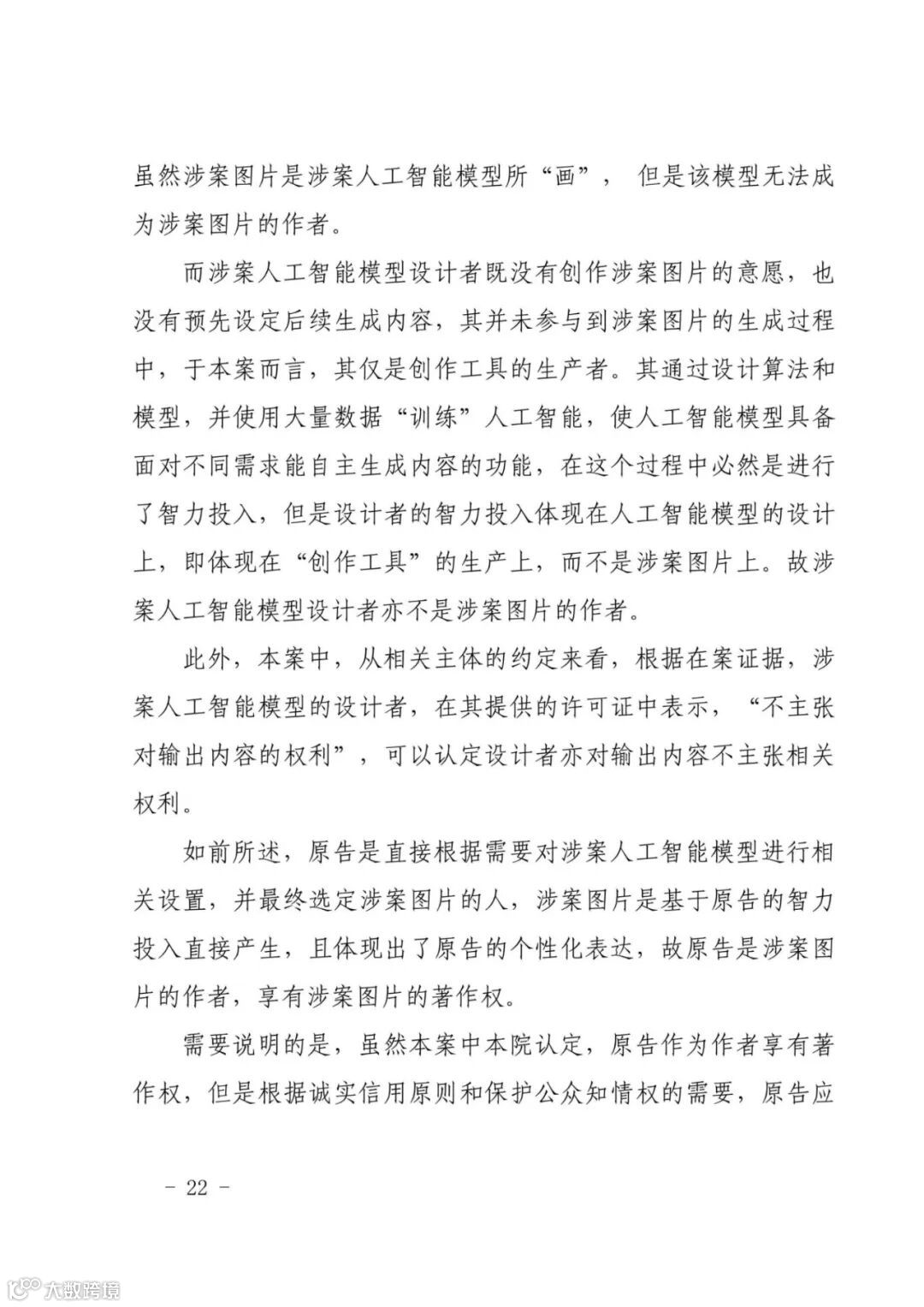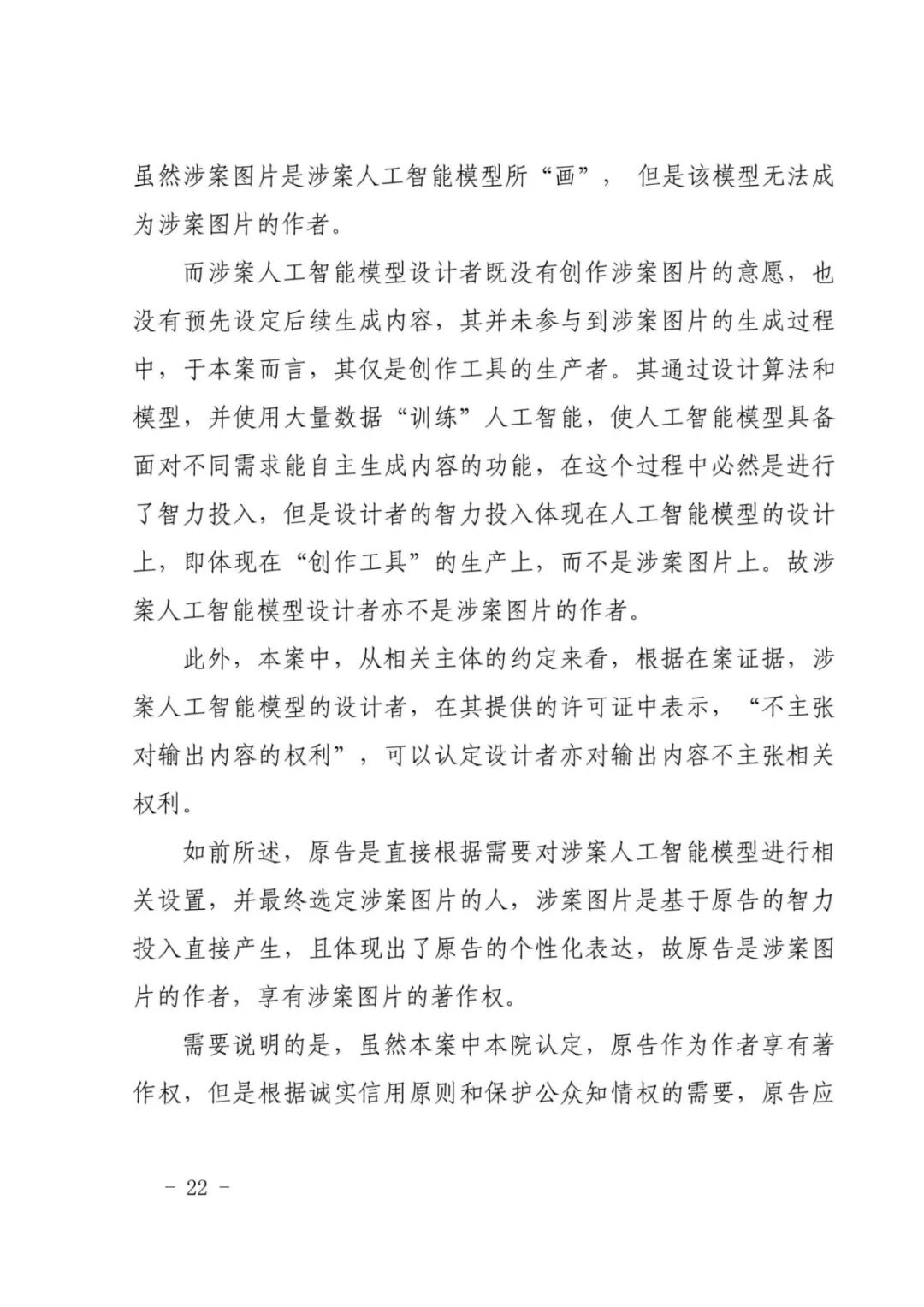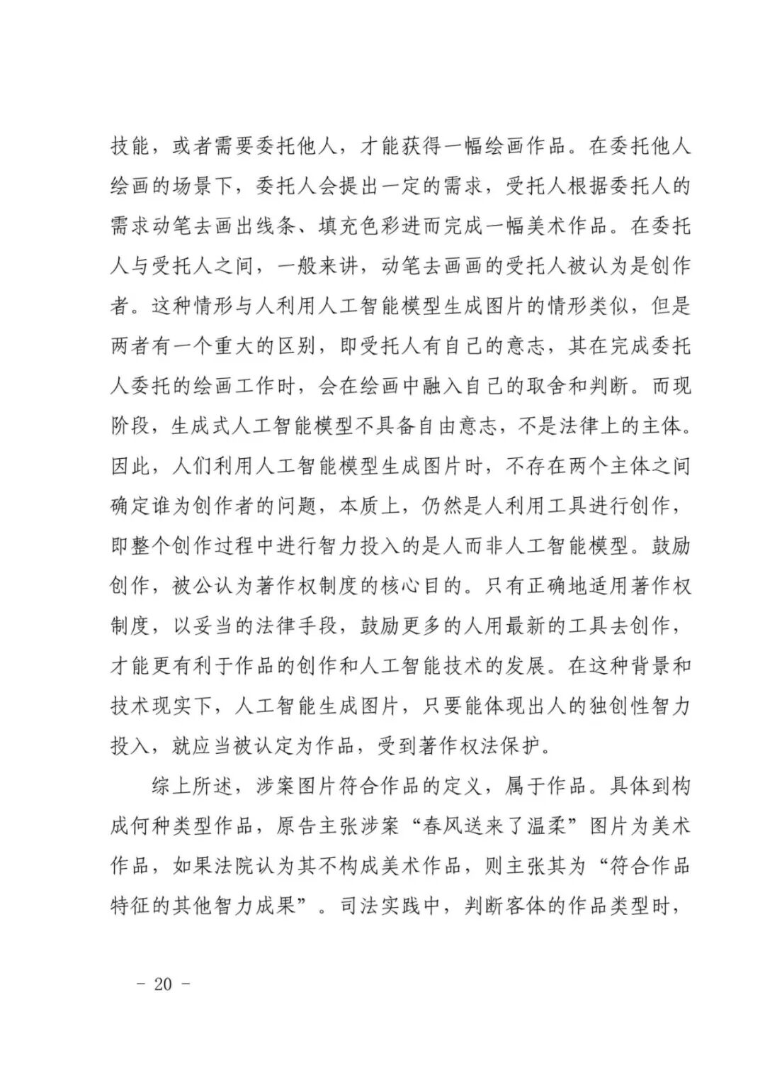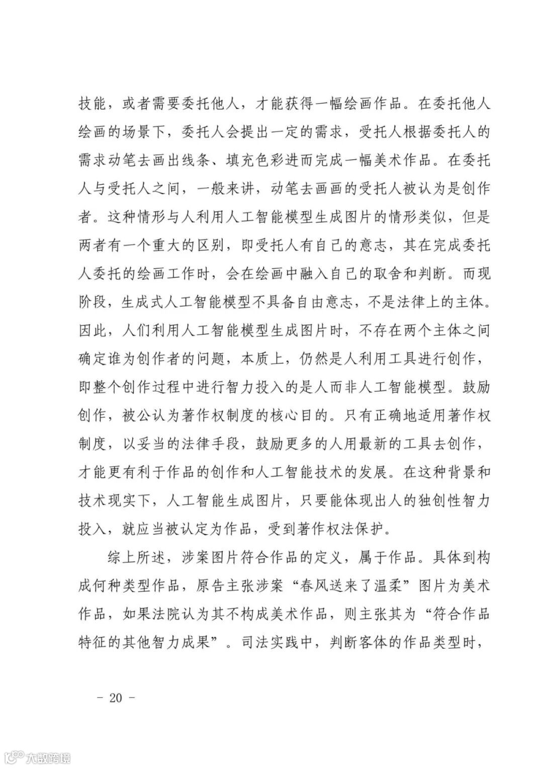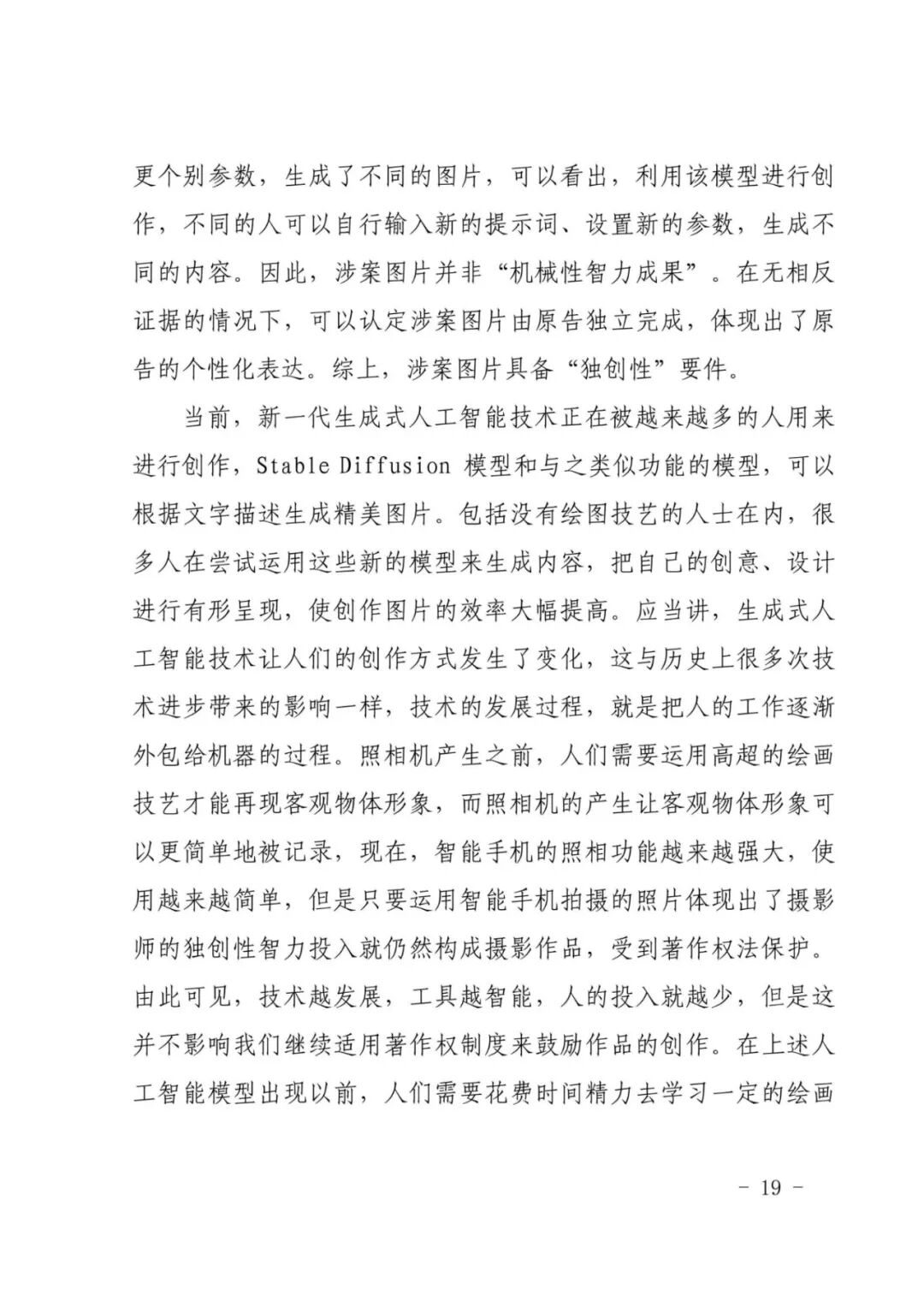 尤其需注意的是,从案件查明事实看,目前网上对AI生成的图片是明确以“AI图片”标注并明码标价的,这说明对于AIGC不同于传统自然人的创作,行业的认知是清晰的。进一步,当图片可以利用AI大模型大量呈现时,人类还有没有必要延续传统绘画技艺的长期学习和训练,还是就此灭绝,这是非常值得思考和追问的。传统美术作品的创作,需要自然人对传统绘画技艺的长期学习和训练,在生成式人工智能大模型将每时每刻“吐出”巨量甚至不计其数的AI图片时,传统自然人直接创作的美术作品应当更为稀缺和昂贵才具有合理性,因此AIGC将随着技术的迭代变得更为廉价。鉴于此,著作权法是否还是适合的法律调整工具需要审慎讨论。也许将传统意义上的人类创作与AIGC加以分割,让“凯撒的归凯撒,上帝的归上帝”更为合理,即传统的自然人创作仍归于著作法保护,如果AIGC需要保护的话,则可以考虑另行制定相关数字产品的专门法律。