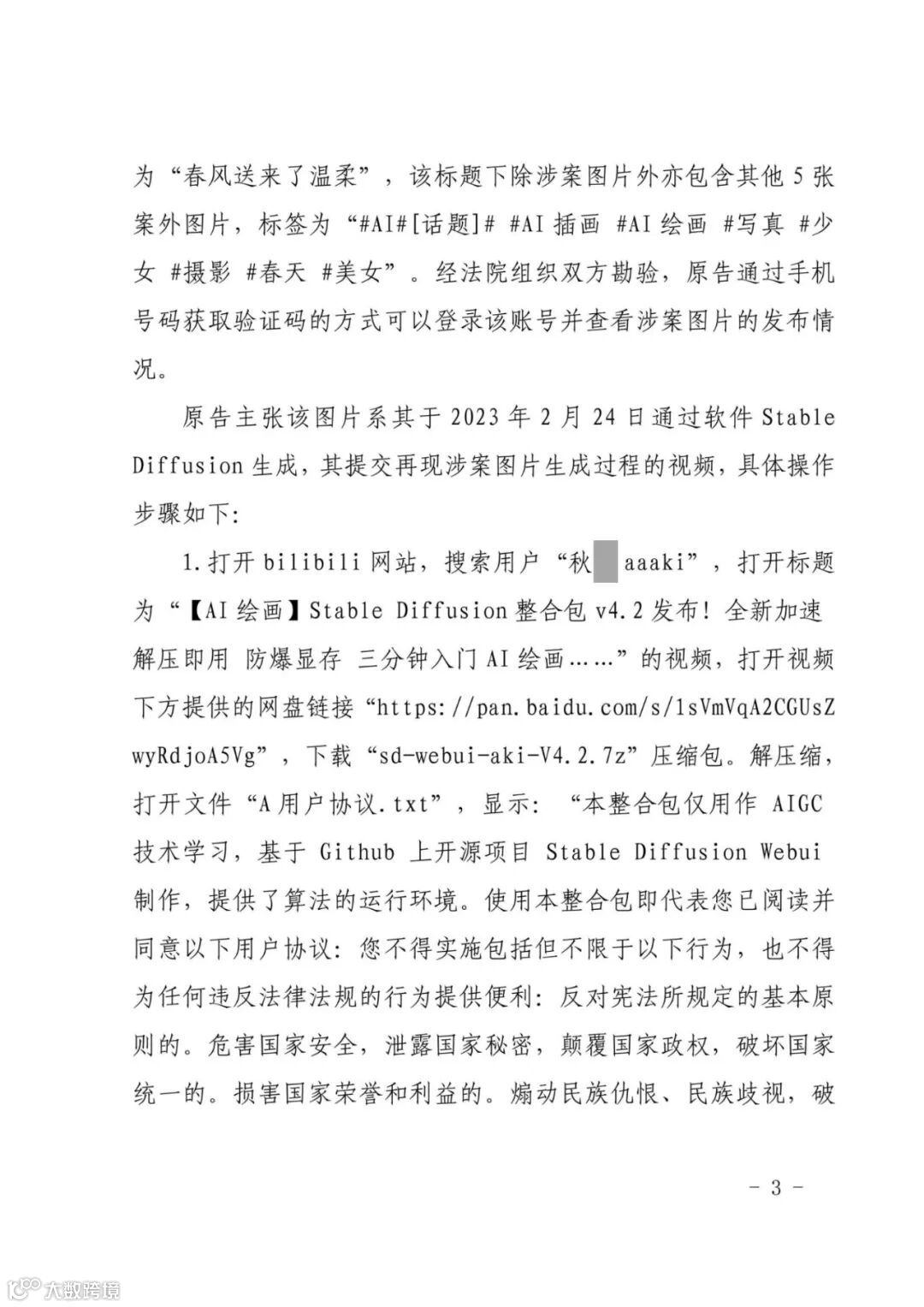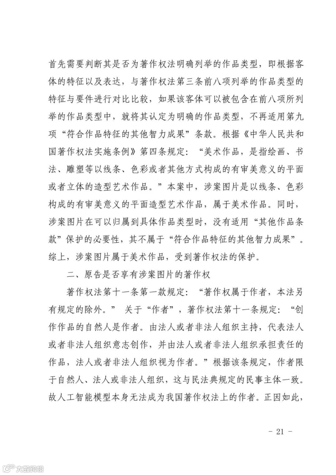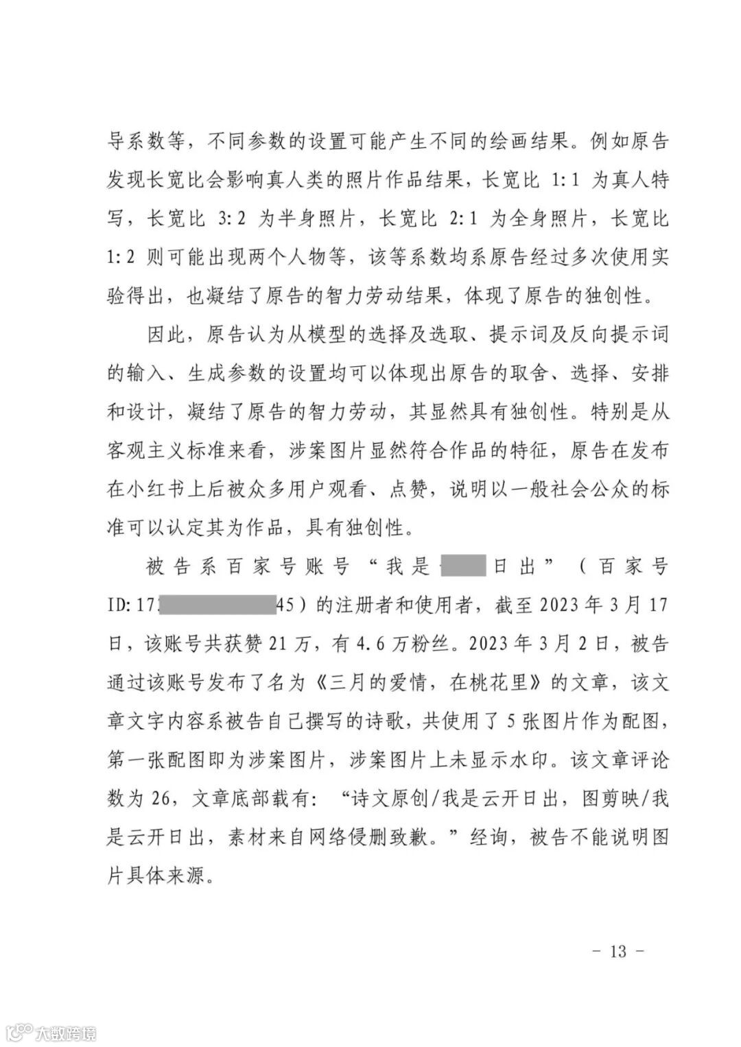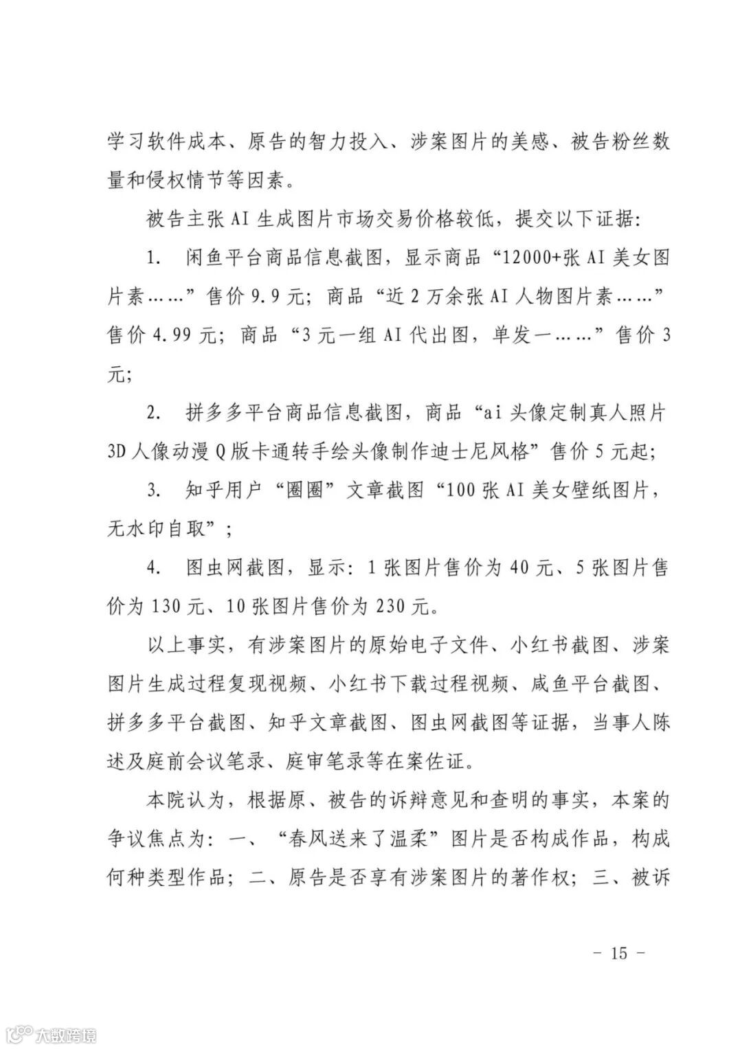 尤其需注意的是,从案件查明事实看,目前网上对AI生成的图片是明确以“AI图片”标注并明码标价的,这说明对于AIGC不同于传统自然人的创作,行业的认知是清晰的。进一步,当图片可以利用AI大模型大量呈现时,人类还有没有必要延续传统绘画技艺的长期学习和训练,还是就此灭绝,这是非常值得思考和追问的。传统美术作品的创作,需要自然人对传统绘画技艺的长期学习和训练,在生成式人工智能大模型将每时每刻“吐出”巨量甚至不计其数的AI图片时,传统自然人直接创作的美术作品应当更为稀缺和昂贵才具有合理性,因此AIGC将随着技术的迭代变得更为廉价。鉴于此,著作权法是否还是适合的法律调整工具需要审慎讨论。也许将传统意义上的人类创作与AIGC加以分割,让“凯撒的归凯撒,上帝的归上帝”更为合理,即传统的自然人创作仍归于著作法保护,如果AIGC需要保护的话,则可以考虑另行制定相关数字产品的专门法律。