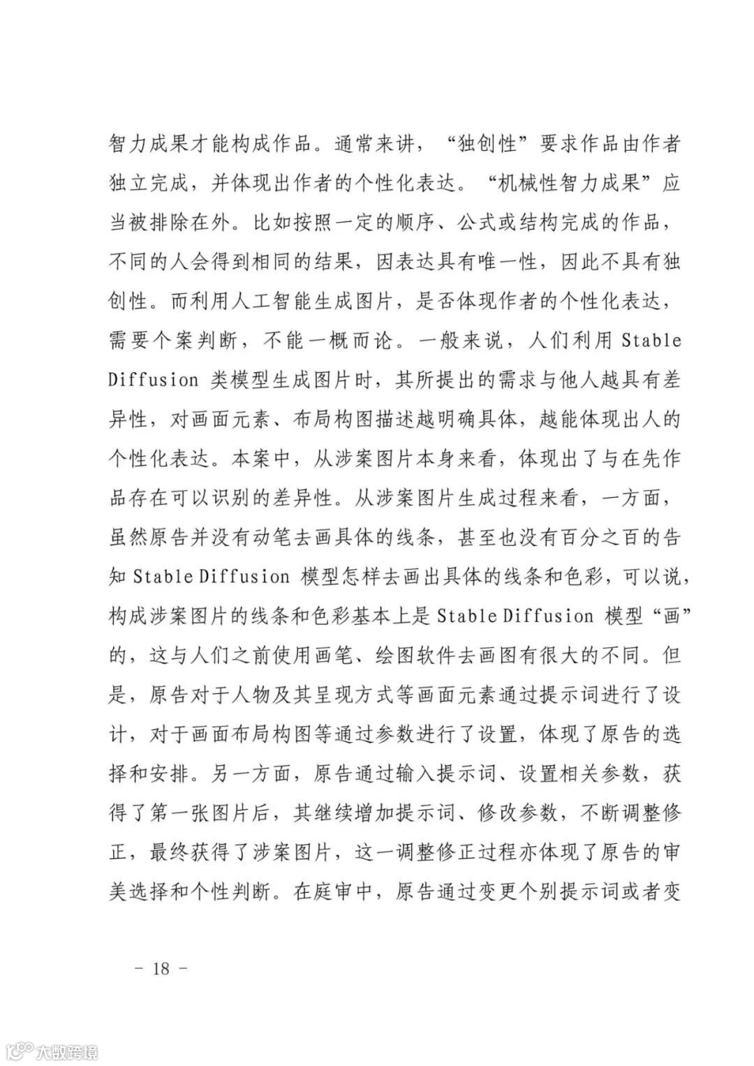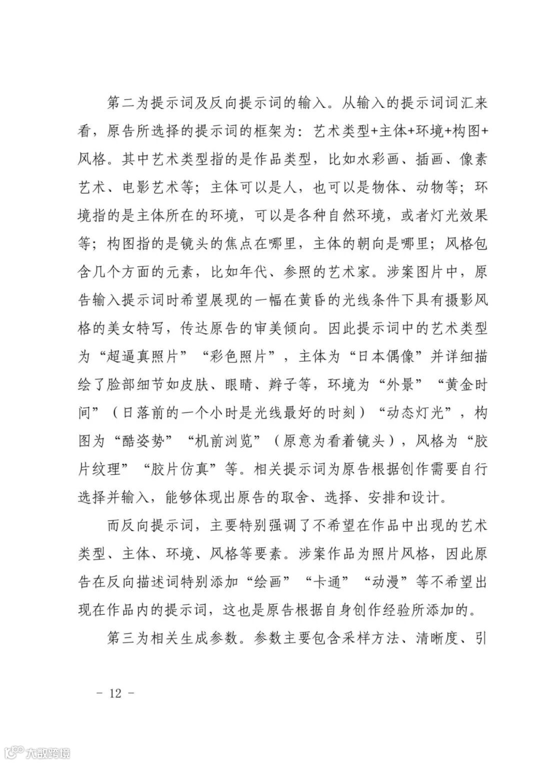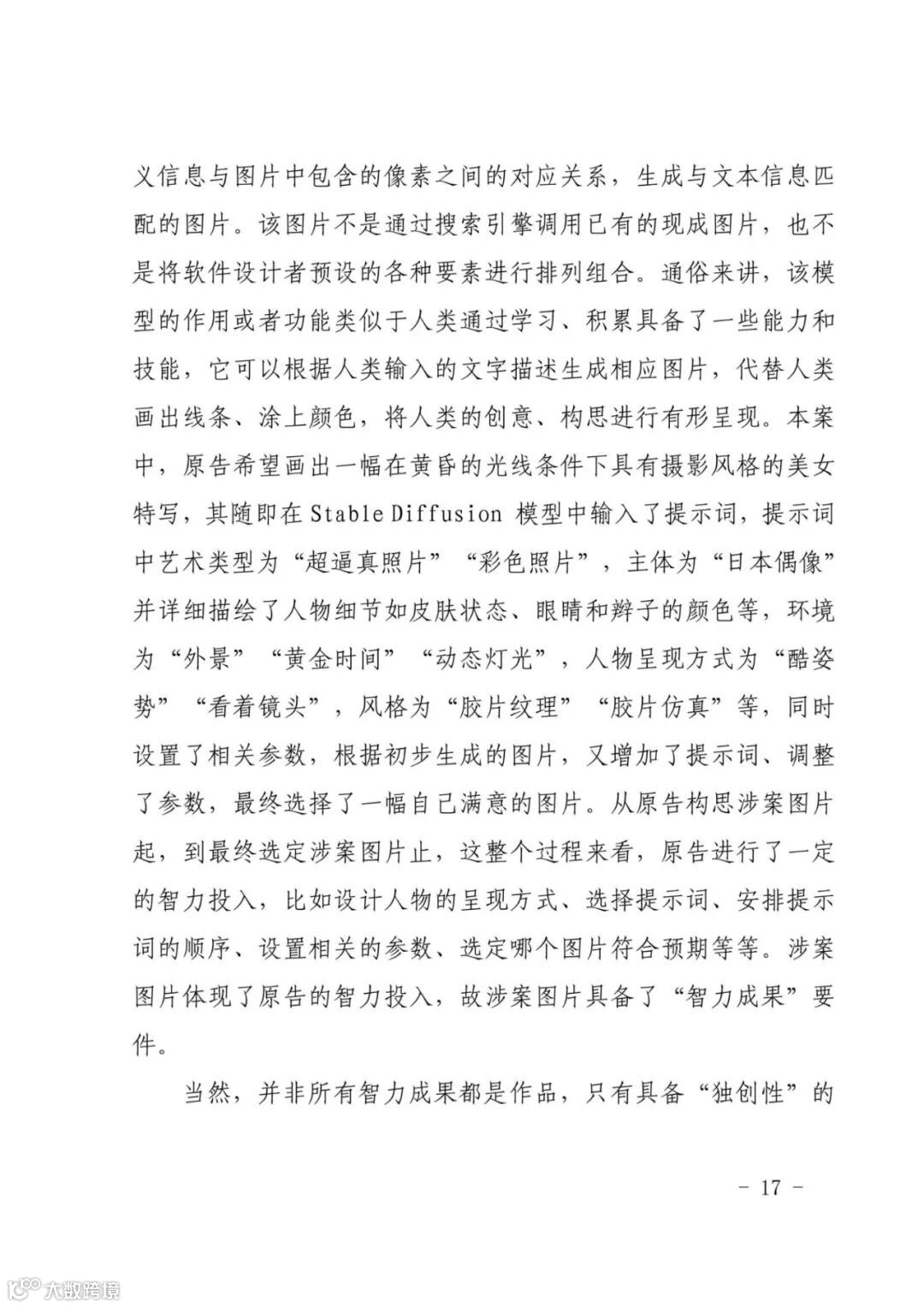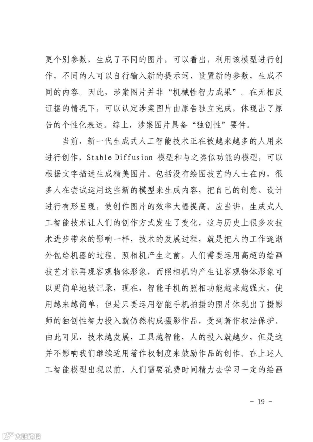 全国审判业务专家宋健表示,首先,北互就该案裁判的探索非常有意义,使得AIGC的定性由学术讨论上升为司法裁判的选择,并促使讨论进一步深化。但由于AIGC涉及的问题十分复杂,目前全球都在审慎讨论之中,因而观点有分歧也很正常。值得注意的是,该案裁判理由中尽管强调AIGC仍然是人类利用工具进行创作,并强调人类技术的发展带来创作手段的变化和进步,但现在生成式人工智能大模型是人类历史上极为重大的颠覆式创新的技术变革,一方面使得AIGC生成物极为海量且源源不断,另一方面AIGC生成的图片,完全系通过参数的设置和调整、提示词以及反向提示词的设置等实现的,尽管最终呈现需要进行不断的设定和选择,但最终生成物仍是由AI自主完成的,远超传统“工具论”背景下自然人对机器创作工具的使用方式。由此,AIGC似乎定义为数字产品更为妥当。