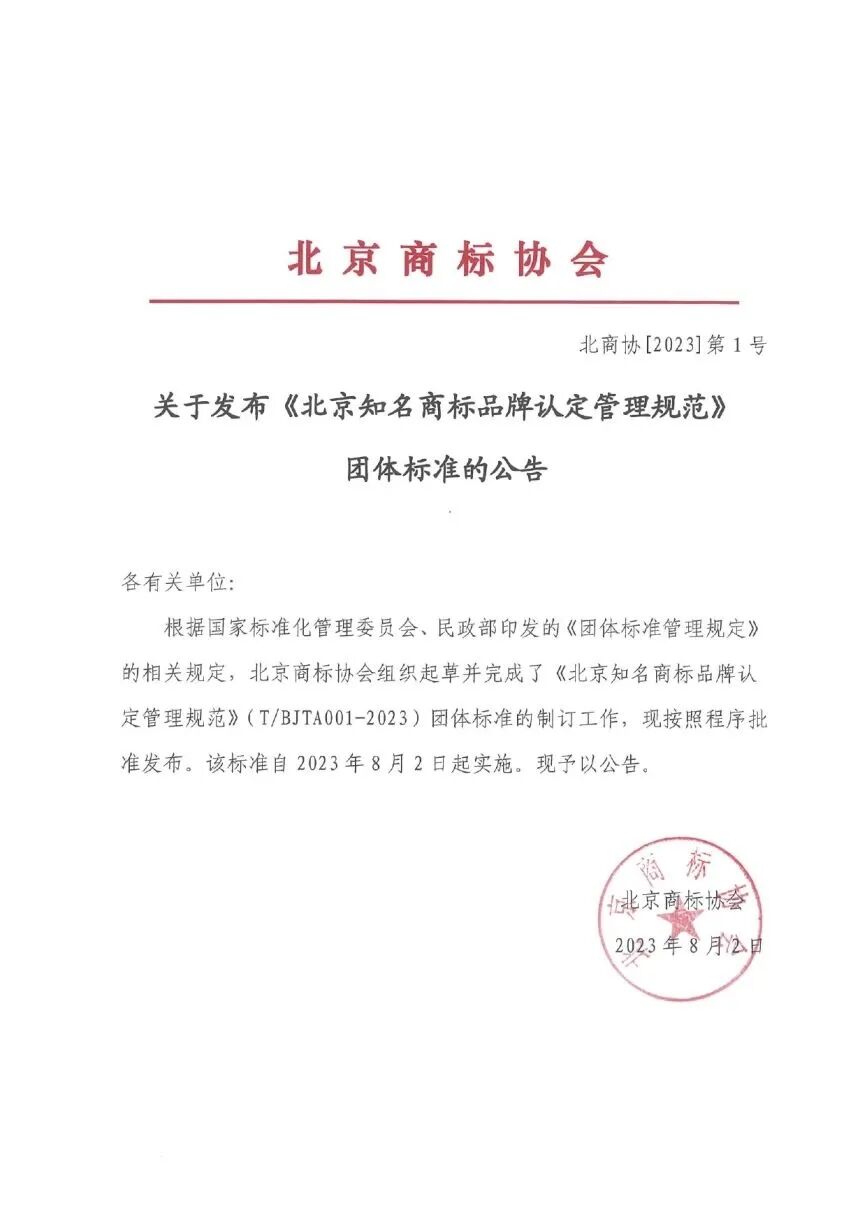 为保护北京知名商标品牌的权利人、使用者和消费者的合法权益,提升商标品牌价值,促进企业提质增效,同时为贯彻国家知识产权局《深入实施〈关于强化知识产权保护的意见〉推进计划》的政策精神,把北京打造成国内及国际商标品牌保护的新高地,将北京品牌推向全国及世界,塑造北京商标品牌保护高水平、高质量发展的新形象,北京商标协会根据《中华人民共和国商标法》《中华人民共和国标准化法》等有关法律法规的规定,经反复讨论分析,起草了《北京知名商标品牌认定管理规范》(讨论草案),并多次组织相关专家学者就内容进行论证,广泛征询各个行业的意见,积极采纳相关修改建议,最终形成《北京知名商标品牌认定管理规范》(T/BJTA 001-2023),该标准自2023年8月2日实施。
