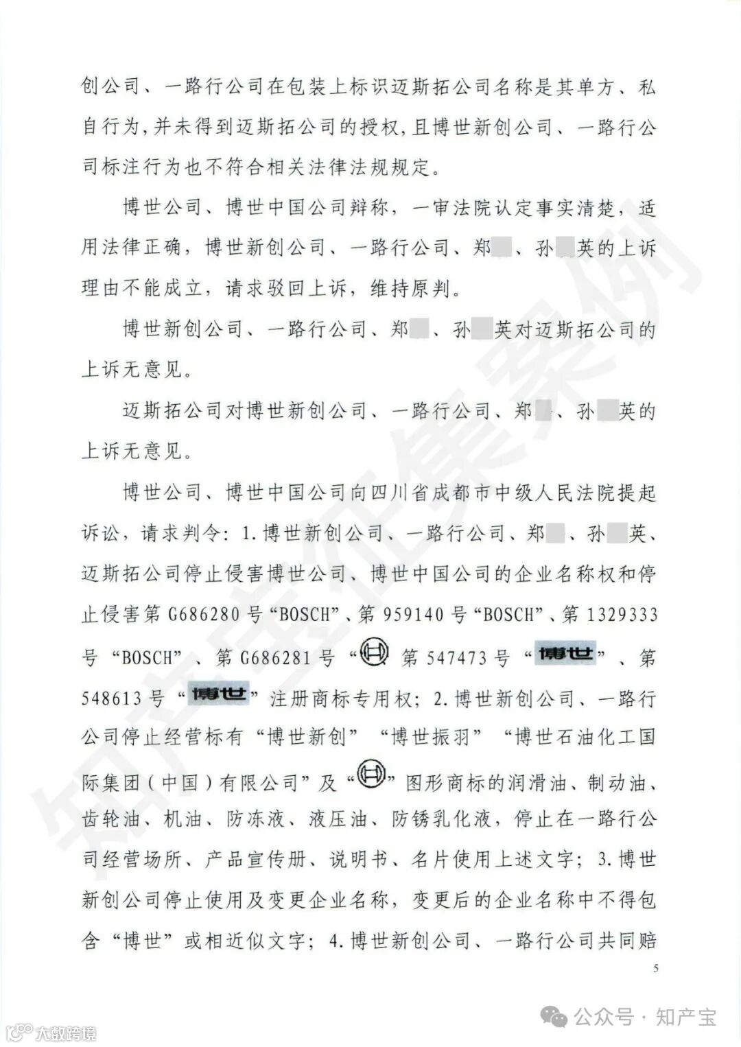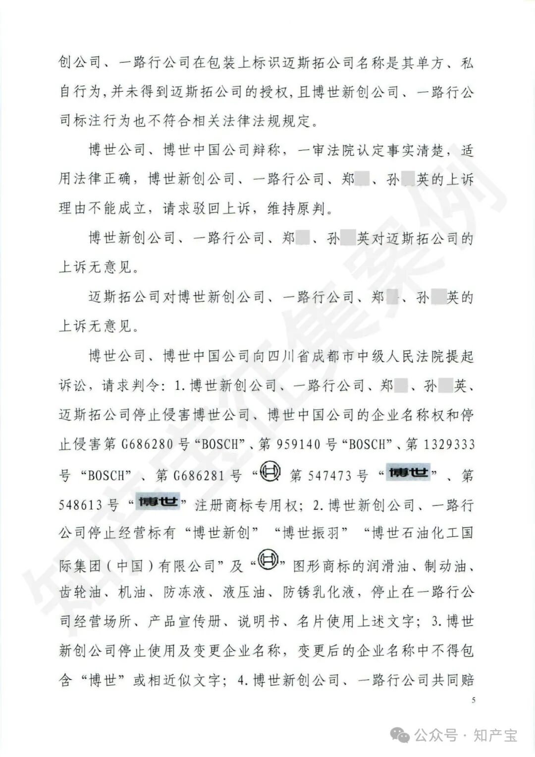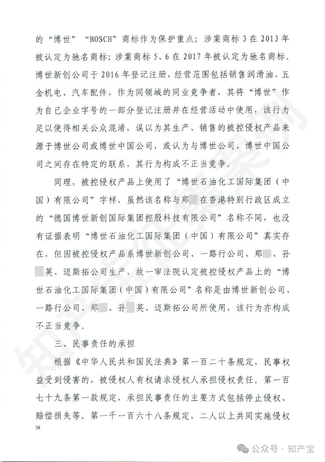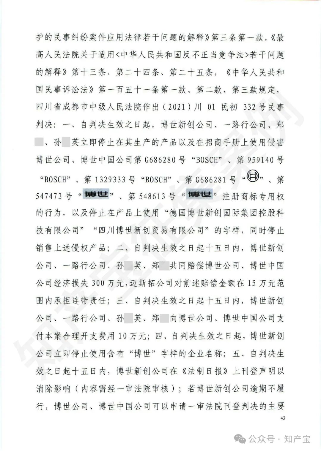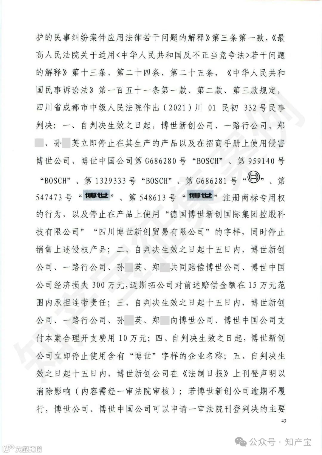 | 一审裁判结果 | 一、自判决生效之日起,博世新创公司、一路行公司、郑*、孙*英立即停止在其生产的产品以及在招商手册上使用侵害博世公司、博世中国公司第 G686280号“BOSCH”、第 959140号“BOSCH”、第1329333号“BOSCH”、第G686281号 547473号 、第548613号 注册商标专用权的行为,以及停止在产品上使用“德国博世新创国际集团控股科技有限公司”“四川博世新创贸易有限公司”的字样,同时停止销售上述侵权产品;二、自判决生效之日起十五日内,博世新创公司、一路行公司、孙*英、郑*共同赔偿博世公司、博世中国公司经济损失300万元,迈斯拓公司对前述赔偿金额在15万元范围内承担连带责任; 三、自判决生效之日起十五日内,博世新创公司、一路行公司、孙*英、郑*向博世公司、博世中国公司支付本案合理开支费用 10万元; 四、自判决生效之日起,博世新创公司立即停止使用含有“博世”字样的企业名称; 五、自判决生效之日起十五日内,博世新创公司在《法制日报》上刊登声明以消除影响(内容需经一审法院审核);若博世新创公司逾期不履行,博世公司、博世中国公司可以申请一审法院刊登判决的主要内容,费用由博世新创公司承担; 六、驳回博世公司、博世中国公司的其他诉讼请求。 |