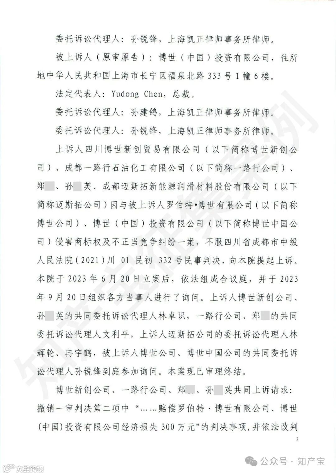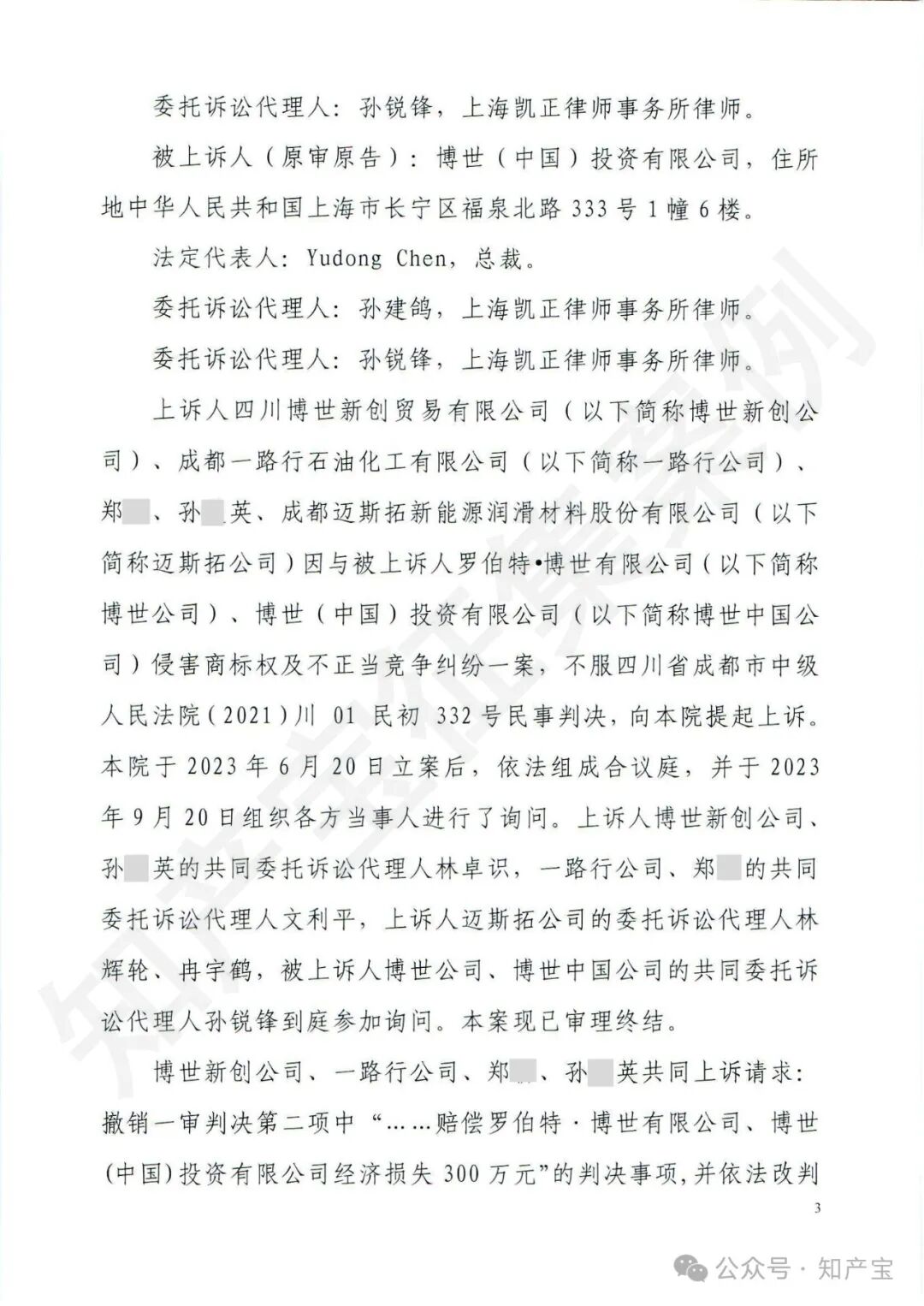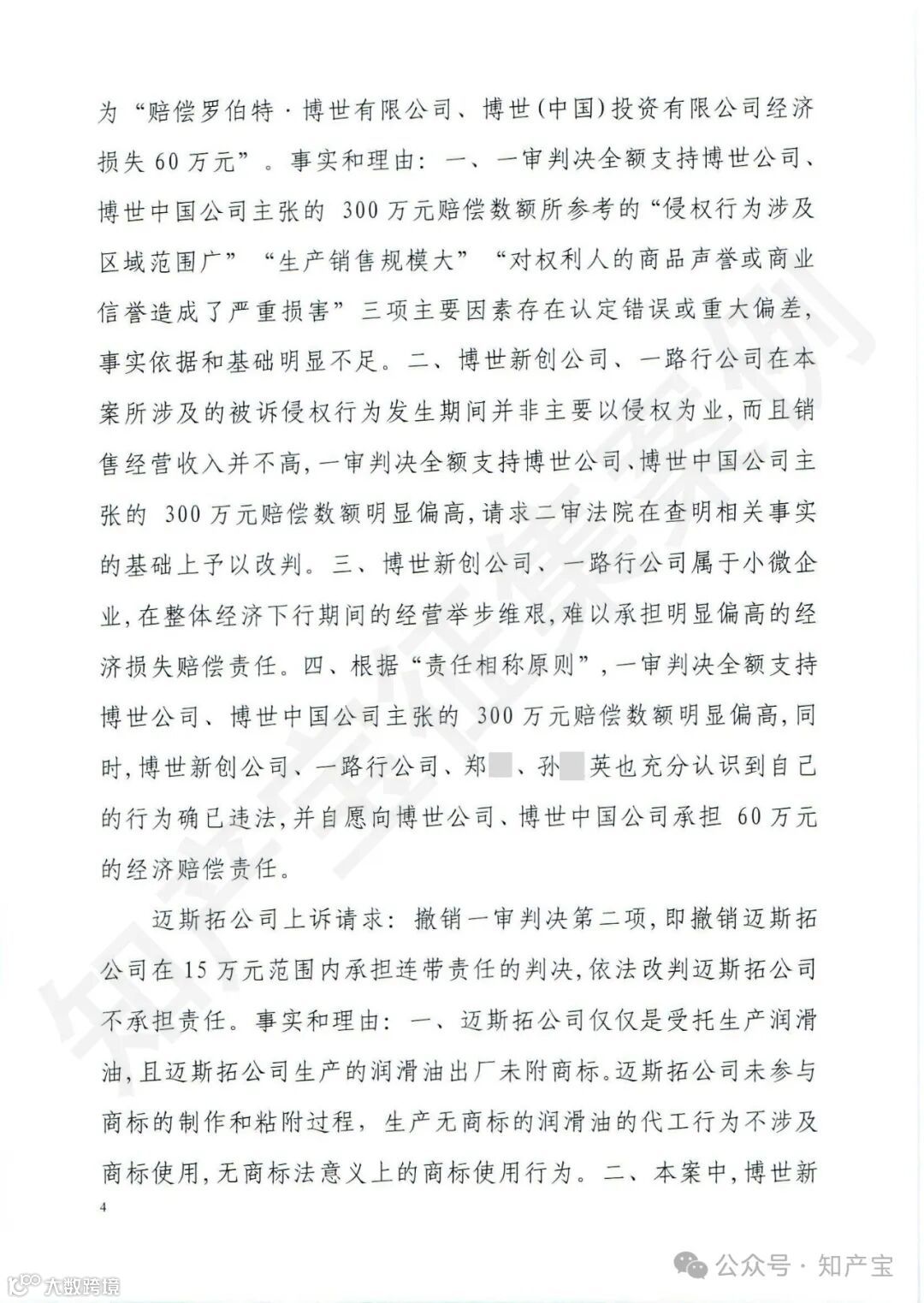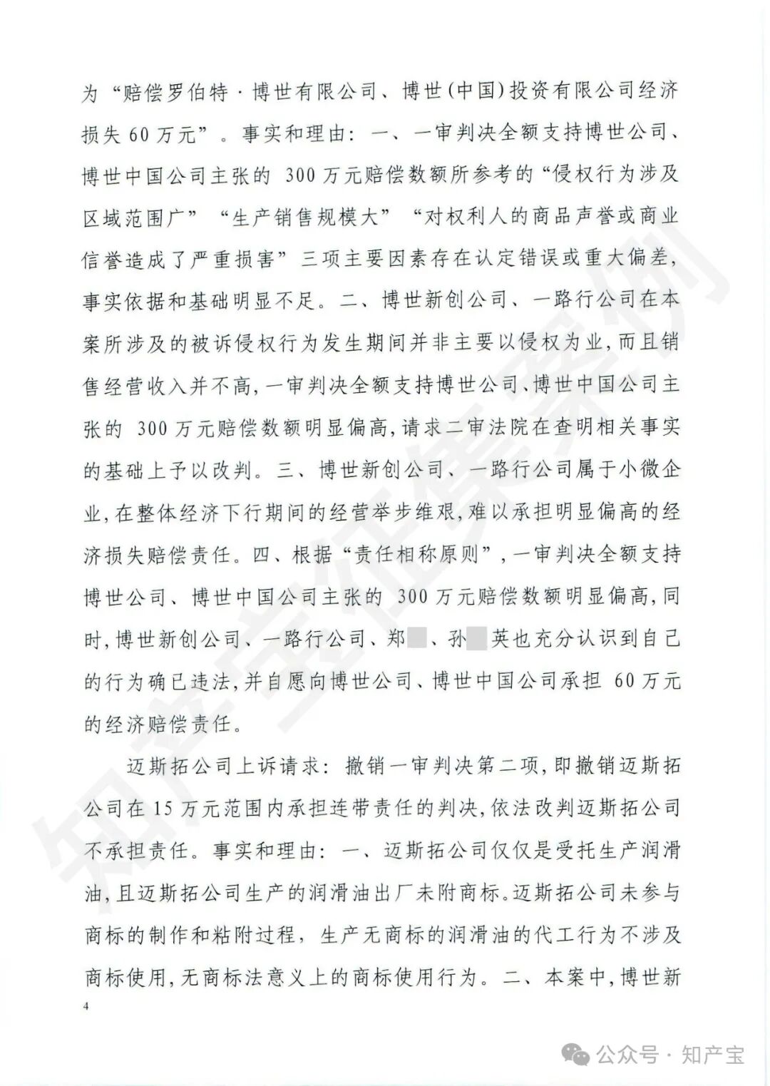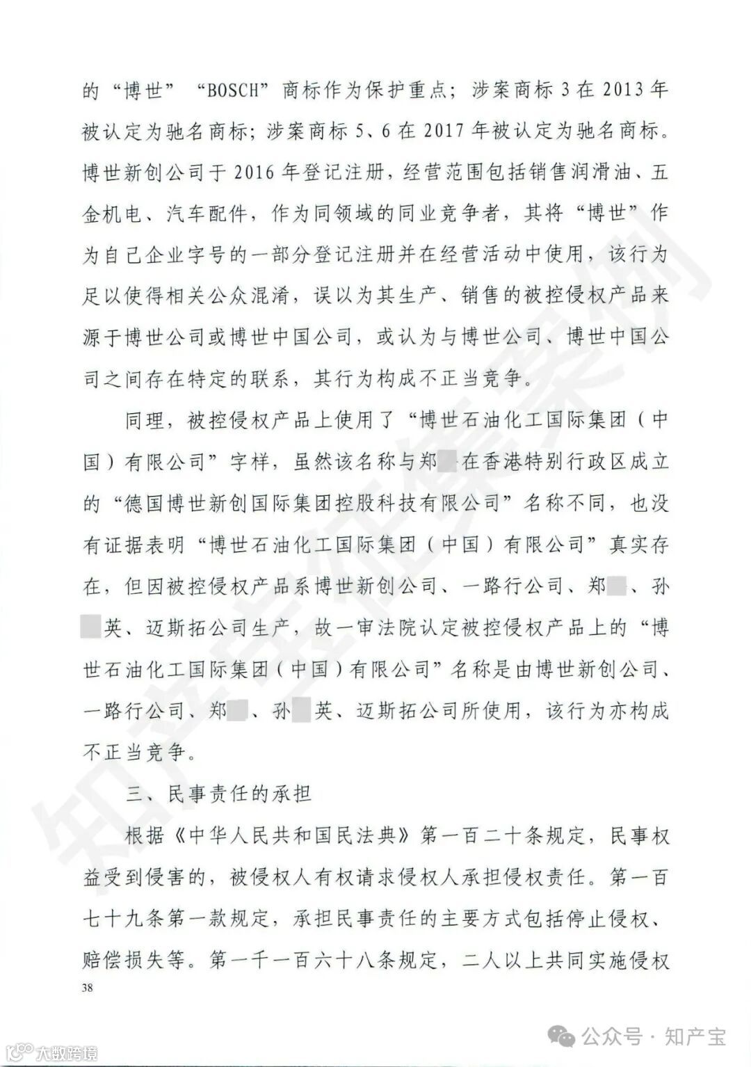 | 一审裁判结果 | 一、自判决生效之日起,博世新创公司、一路行公司、郑*、孙*英立即停止在其生产的产品以及在招商手册上使用侵害博世公司、博世中国公司第 G686280号“BOSCH”、第 959140号“BOSCH”、第1329333号“BOSCH”、第G686281号 547473号 、第548613号 注册商标专用权的行为,以及停止在产品上使用“德国博世新创国际集团控股科技有限公司”“四川博世新创贸易有限公司”的字样,同时停止销售上述侵权产品;二、自判决生效之日起十五日内,博世新创公司、一路行公司、孙*英、郑*共同赔偿博世公司、博世中国公司经济损失300万元,迈斯拓公司对前述赔偿金额在15万元范围内承担连带责任; 三、自判决生效之日起十五日内,博世新创公司、一路行公司、孙*英、郑*向博世公司、博世中国公司支付本案合理开支费用 10万元; 四、自判决生效之日起,博世新创公司立即停止使用含有“博世”字样的企业名称; 五、自判决生效之日起十五日内,博世新创公司在《法制日报》上刊登声明以消除影响(内容需经一审法院审核);若博世新创公司逾期不履行,博世公司、博世中国公司可以申请一审法院刊登判决的主要内容,费用由博世新创公司承担; 六、驳回博世公司、博世中国公司的其他诉讼请求。 |