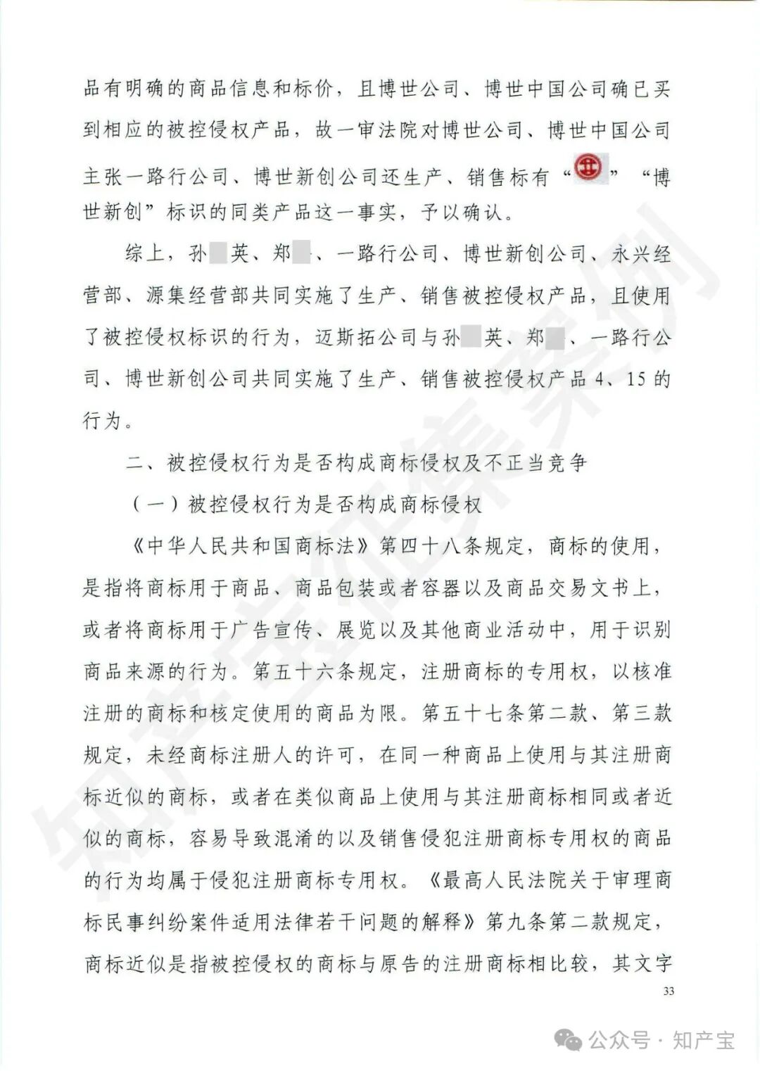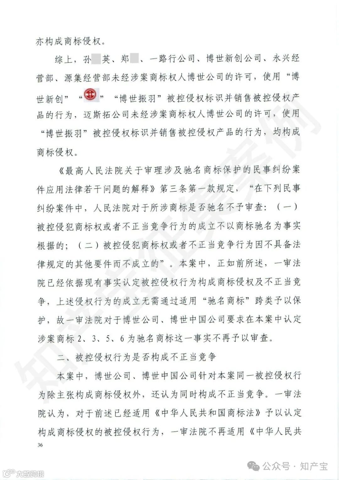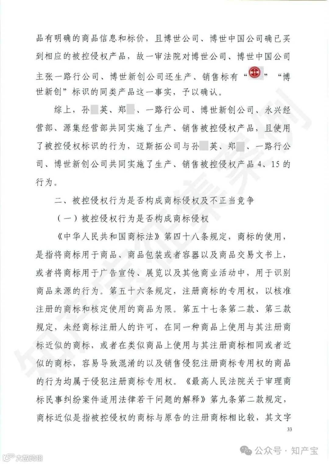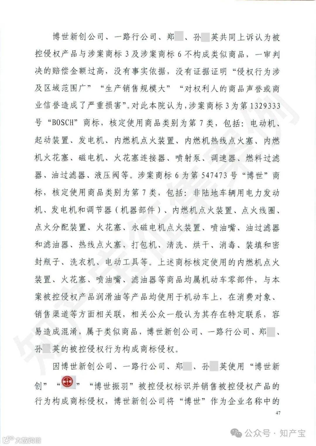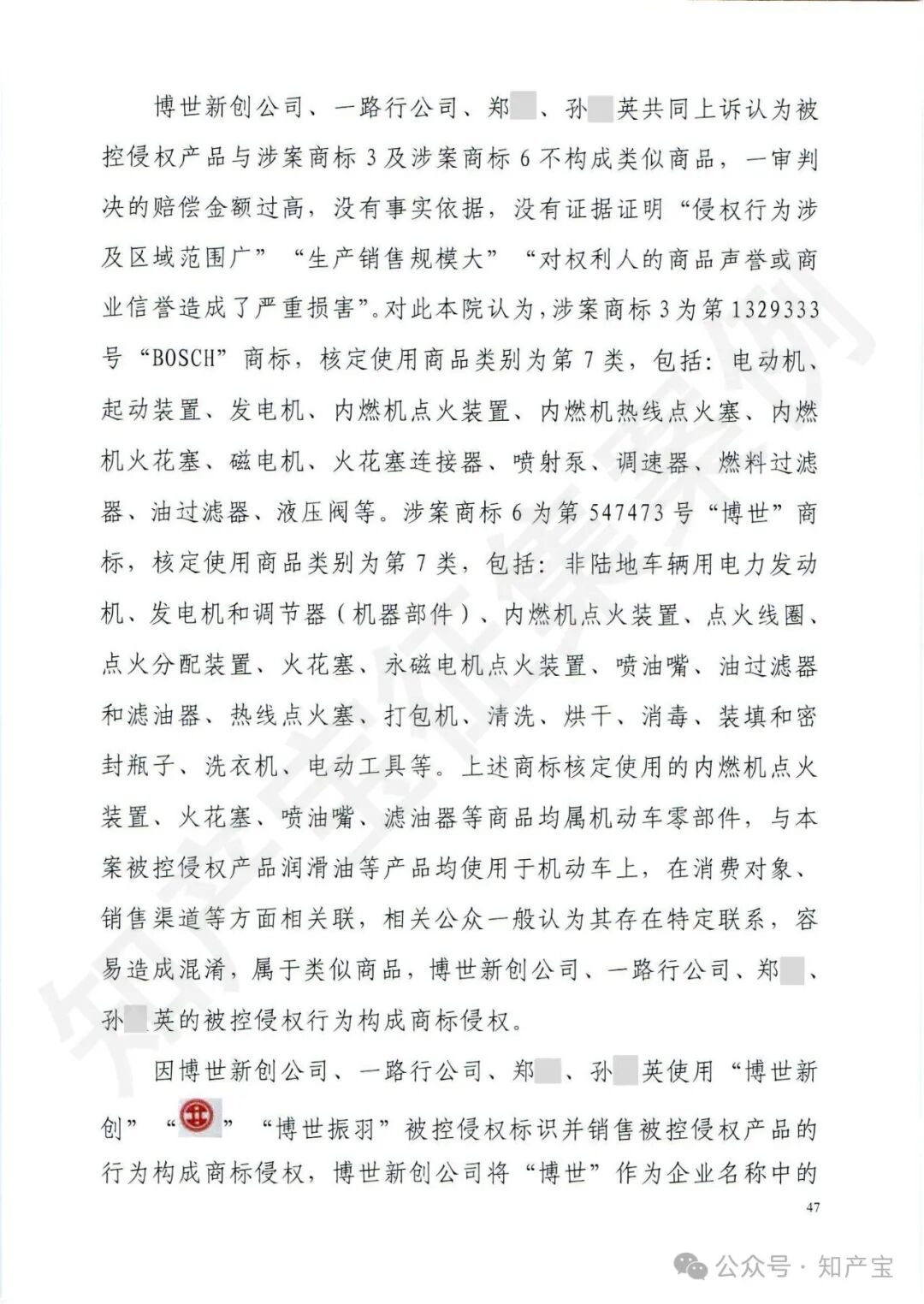 | 一审裁判结果 | 一、自判决生效之日起,博世新创公司、一路行公司、郑*、孙*英立即停止在其生产的产品以及在招商手册上使用侵害博世公司、博世中国公司第 G686280号“BOSCH”、第 959140号“BOSCH”、第1329333号“BOSCH”、第G686281号 547473号 、第548613号 注册商标专用权的行为,以及停止在产品上使用“德国博世新创国际集团控股科技有限公司”“四川博世新创贸易有限公司”的字样,同时停止销售上述侵权产品;二、自判决生效之日起十五日内,博世新创公司、一路行公司、孙*英、郑*共同赔偿博世公司、博世中国公司经济损失300万元,迈斯拓公司对前述赔偿金额在15万元范围内承担连带责任; 三、自判决生效之日起十五日内,博世新创公司、一路行公司、孙*英、郑*向博世公司、博世中国公司支付本案合理开支费用 10万元; 四、自判决生效之日起,博世新创公司立即停止使用含有“博世”字样的企业名称; 五、自判决生效之日起十五日内,博世新创公司在《法制日报》上刊登声明以消除影响(内容需经一审法院审核);若博世新创公司逾期不履行,博世公司、博世中国公司可以申请一审法院刊登判决的主要内容,费用由博世新创公司承担; 六、驳回博世公司、博世中国公司的其他诉讼请求。 |