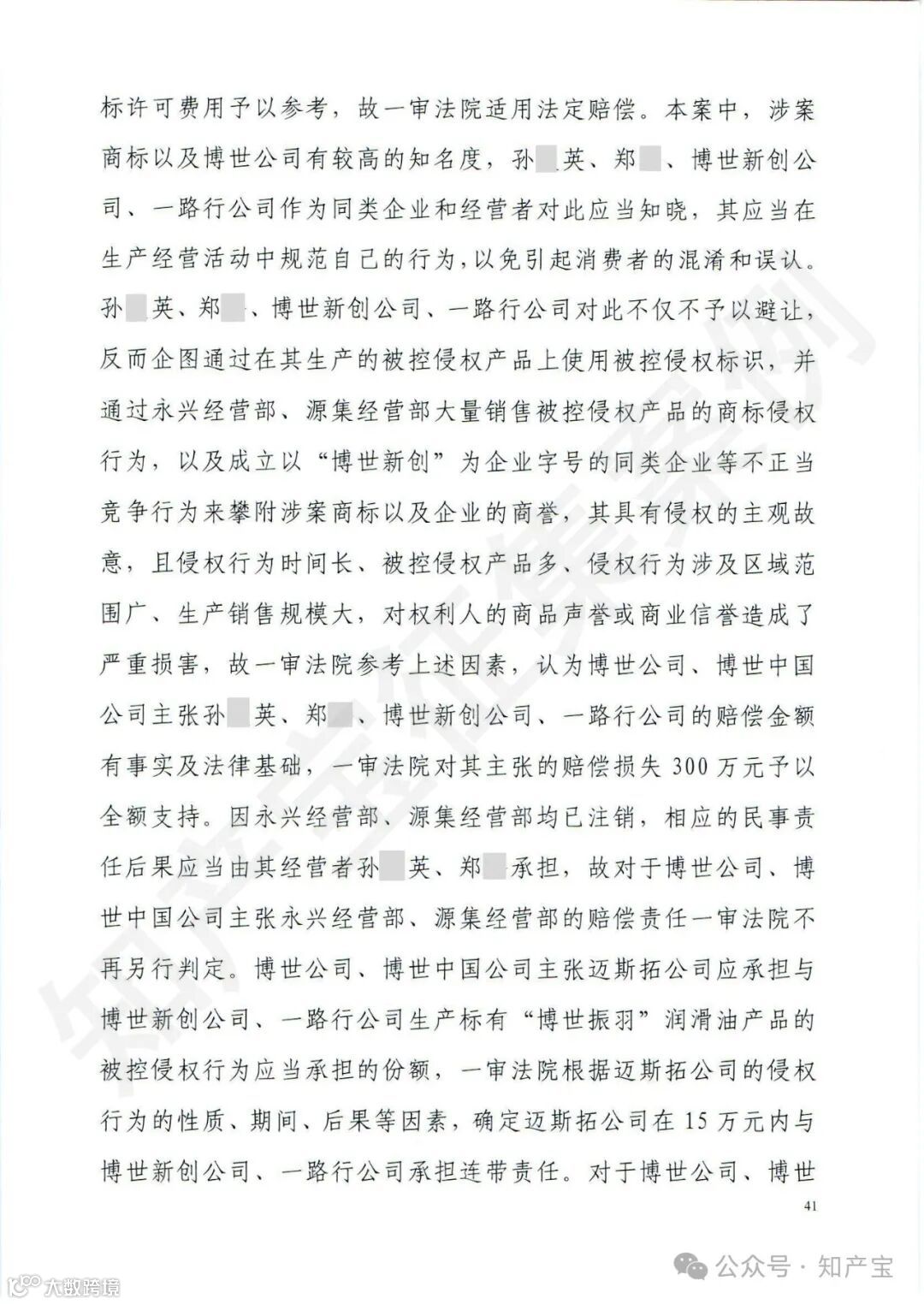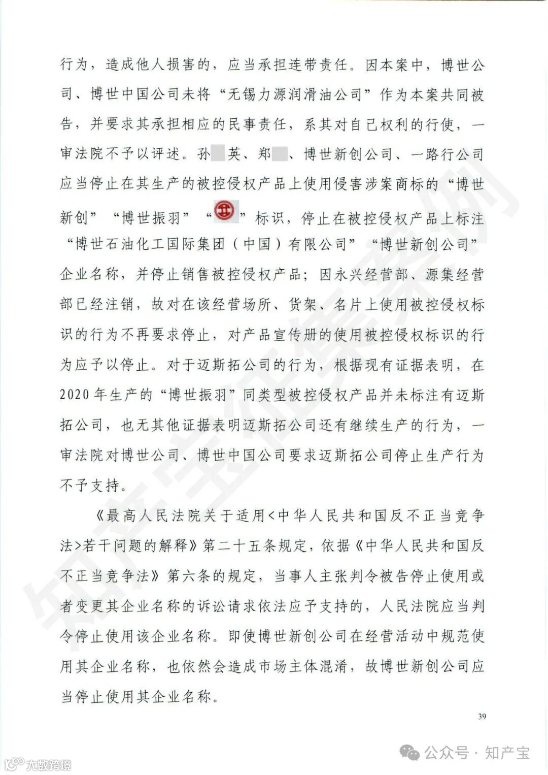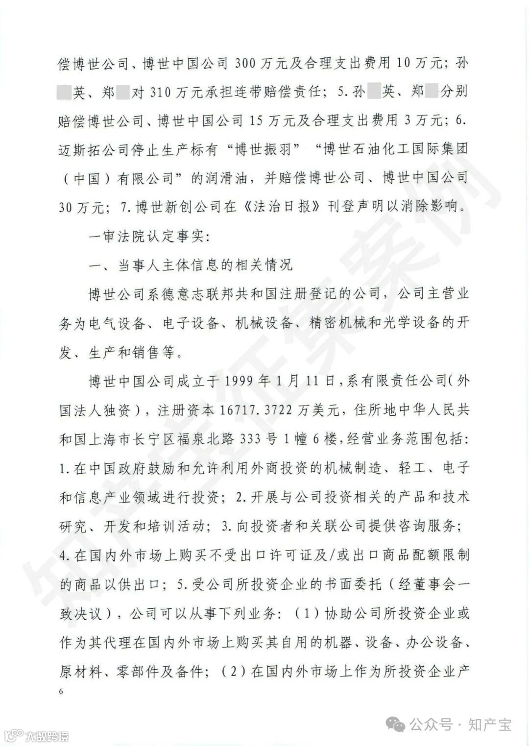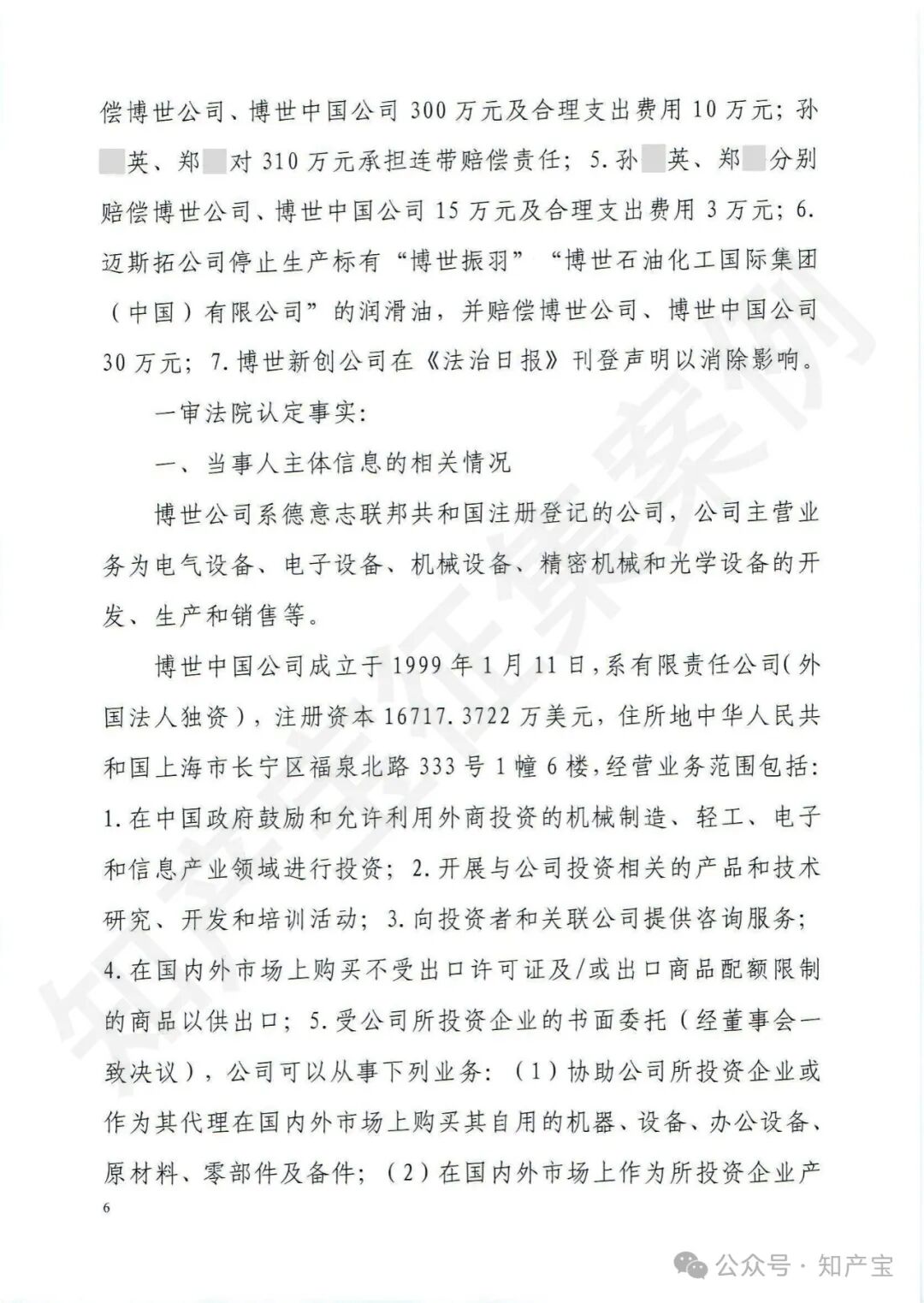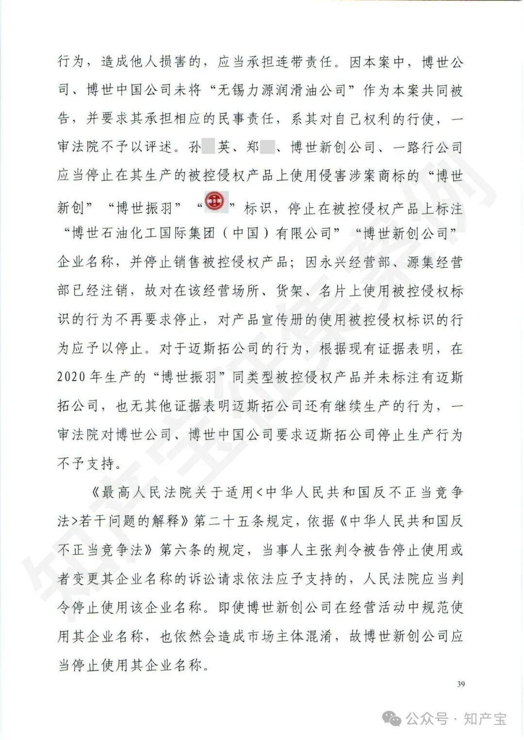 | 一审裁判结果 | 一、自判决生效之日起,博世新创公司、一路行公司、郑*、孙*英立即停止在其生产的产品以及在招商手册上使用侵害博世公司、博世中国公司第 G686280号“BOSCH”、第 959140号“BOSCH”、第1329333号“BOSCH”、第G686281号 547473号 、第548613号 注册商标专用权的行为,以及停止在产品上使用“德国博世新创国际集团控股科技有限公司”“四川博世新创贸易有限公司”的字样,同时停止销售上述侵权产品;二、自判决生效之日起十五日内,博世新创公司、一路行公司、孙*英、郑*共同赔偿博世公司、博世中国公司经济损失300万元,迈斯拓公司对前述赔偿金额在15万元范围内承担连带责任; 三、自判决生效之日起十五日内,博世新创公司、一路行公司、孙*英、郑*向博世公司、博世中国公司支付本案合理开支费用 10万元; 四、自判决生效之日起,博世新创公司立即停止使用含有“博世”字样的企业名称; 五、自判决生效之日起十五日内,博世新创公司在《法制日报》上刊登声明以消除影响(内容需经一审法院审核);若博世新创公司逾期不履行,博世公司、博世中国公司可以申请一审法院刊登判决的主要内容,费用由博世新创公司承担; 六、驳回博世公司、博世中国公司的其他诉讼请求。 |