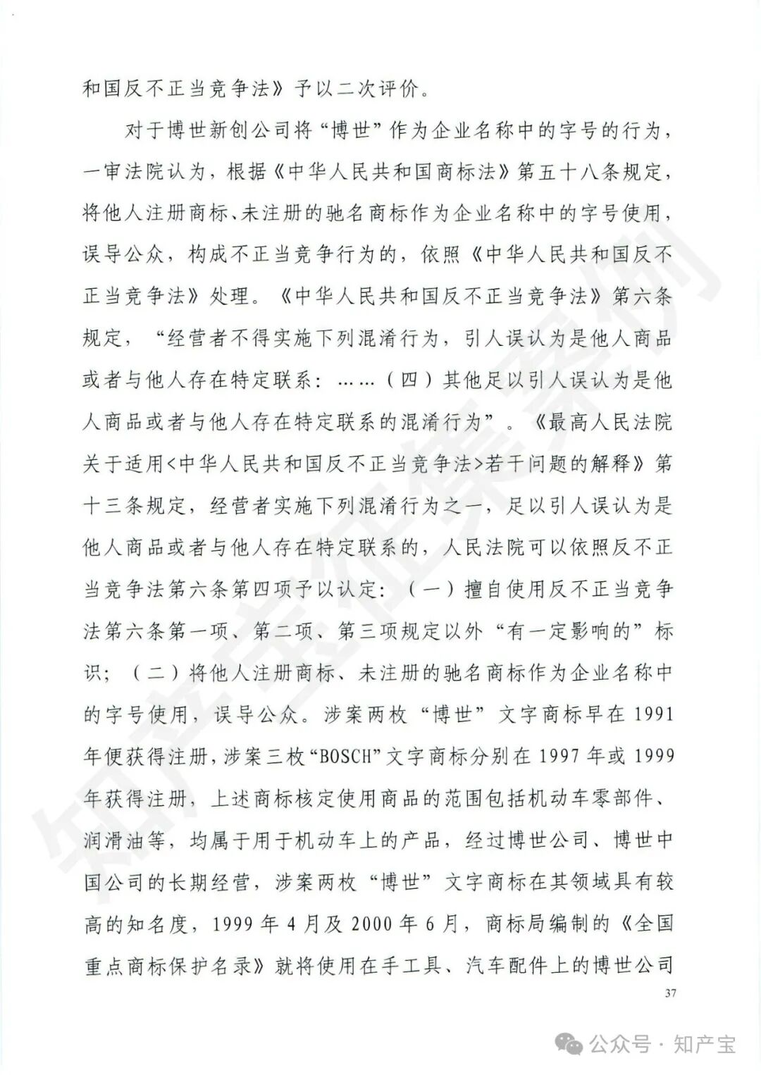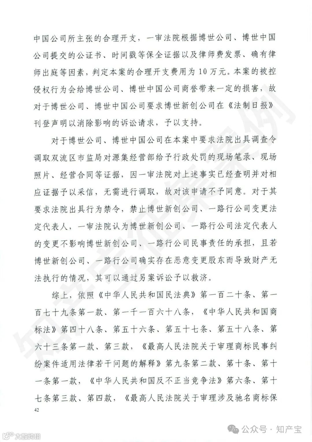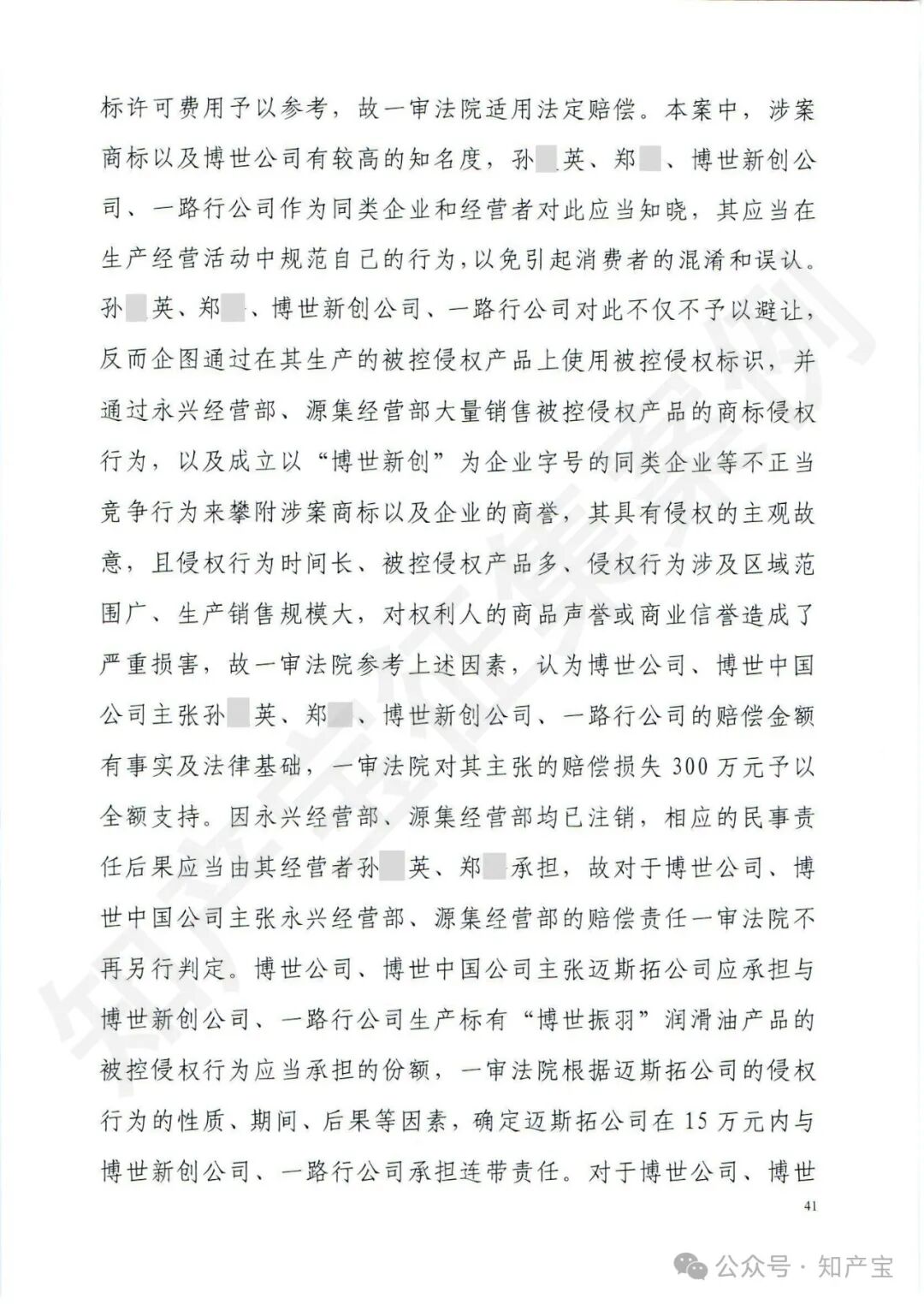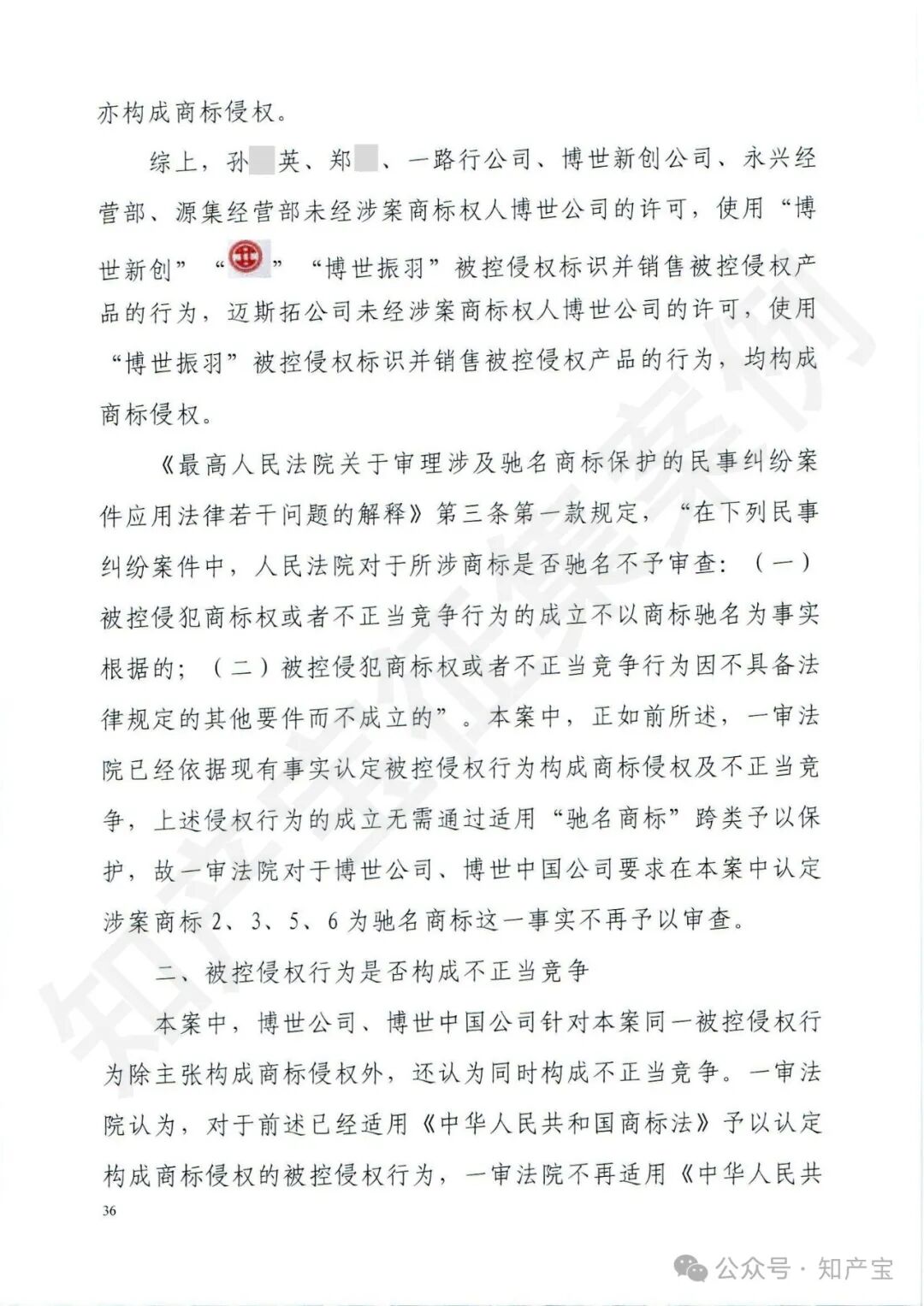 | 一审裁判结果 | 一、自判决生效之日起,博世新创公司、一路行公司、郑*、孙*英立即停止在其生产的产品以及在招商手册上使用侵害博世公司、博世中国公司第 G686280号“BOSCH”、第 959140号“BOSCH”、第1329333号“BOSCH”、第G686281号 547473号 、第548613号 注册商标专用权的行为,以及停止在产品上使用“德国博世新创国际集团控股科技有限公司”“四川博世新创贸易有限公司”的字样,同时停止销售上述侵权产品;二、自判决生效之日起十五日内,博世新创公司、一路行公司、孙*英、郑*共同赔偿博世公司、博世中国公司经济损失300万元,迈斯拓公司对前述赔偿金额在15万元范围内承担连带责任; 三、自判决生效之日起十五日内,博世新创公司、一路行公司、孙*英、郑*向博世公司、博世中国公司支付本案合理开支费用 10万元; 四、自判决生效之日起,博世新创公司立即停止使用含有“博世”字样的企业名称; 五、自判决生效之日起十五日内,博世新创公司在《法制日报》上刊登声明以消除影响(内容需经一审法院审核);若博世新创公司逾期不履行,博世公司、博世中国公司可以申请一审法院刊登判决的主要内容,费用由博世新创公司承担; 六、驳回博世公司、博世中国公司的其他诉讼请求。 |