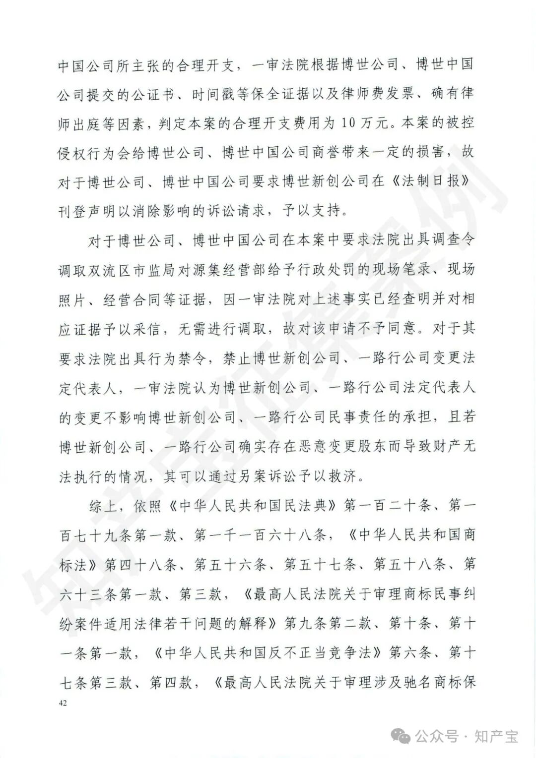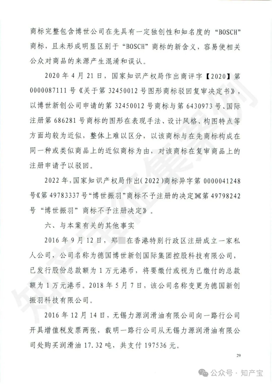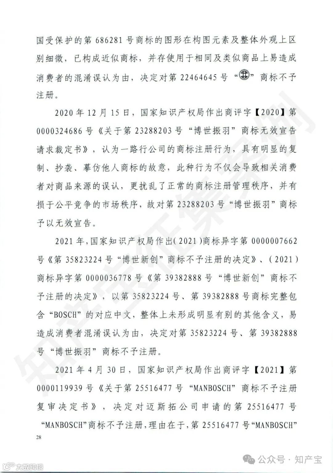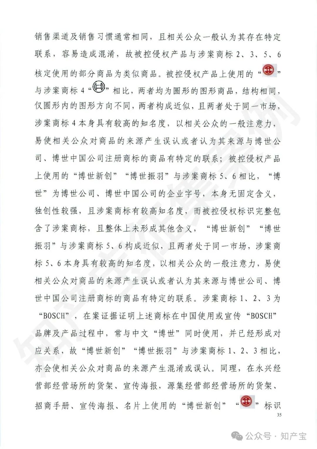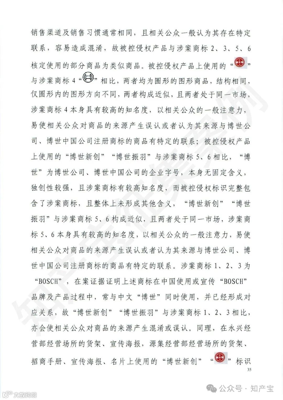 | 一审裁判结果 | 一、自判决生效之日起,博世新创公司、一路行公司、郑*、孙*英立即停止在其生产的产品以及在招商手册上使用侵害博世公司、博世中国公司第 G686280号“BOSCH”、第 959140号“BOSCH”、第1329333号“BOSCH”、第G686281号 547473号 、第548613号 注册商标专用权的行为,以及停止在产品上使用“德国博世新创国际集团控股科技有限公司”“四川博世新创贸易有限公司”的字样,同时停止销售上述侵权产品;二、自判决生效之日起十五日内,博世新创公司、一路行公司、孙*英、郑*共同赔偿博世公司、博世中国公司经济损失300万元,迈斯拓公司对前述赔偿金额在15万元范围内承担连带责任; 三、自判决生效之日起十五日内,博世新创公司、一路行公司、孙*英、郑*向博世公司、博世中国公司支付本案合理开支费用 10万元; 四、自判决生效之日起,博世新创公司立即停止使用含有“博世”字样的企业名称; 五、自判决生效之日起十五日内,博世新创公司在《法制日报》上刊登声明以消除影响(内容需经一审法院审核);若博世新创公司逾期不履行,博世公司、博世中国公司可以申请一审法院刊登判决的主要内容,费用由博世新创公司承担; 六、驳回博世公司、博世中国公司的其他诉讼请求。 |