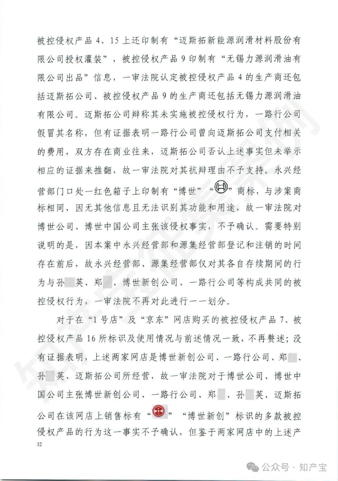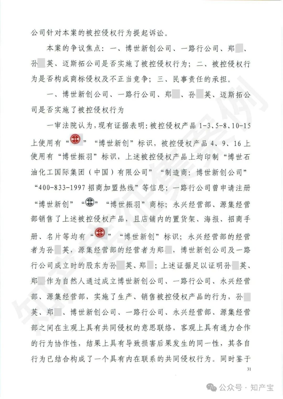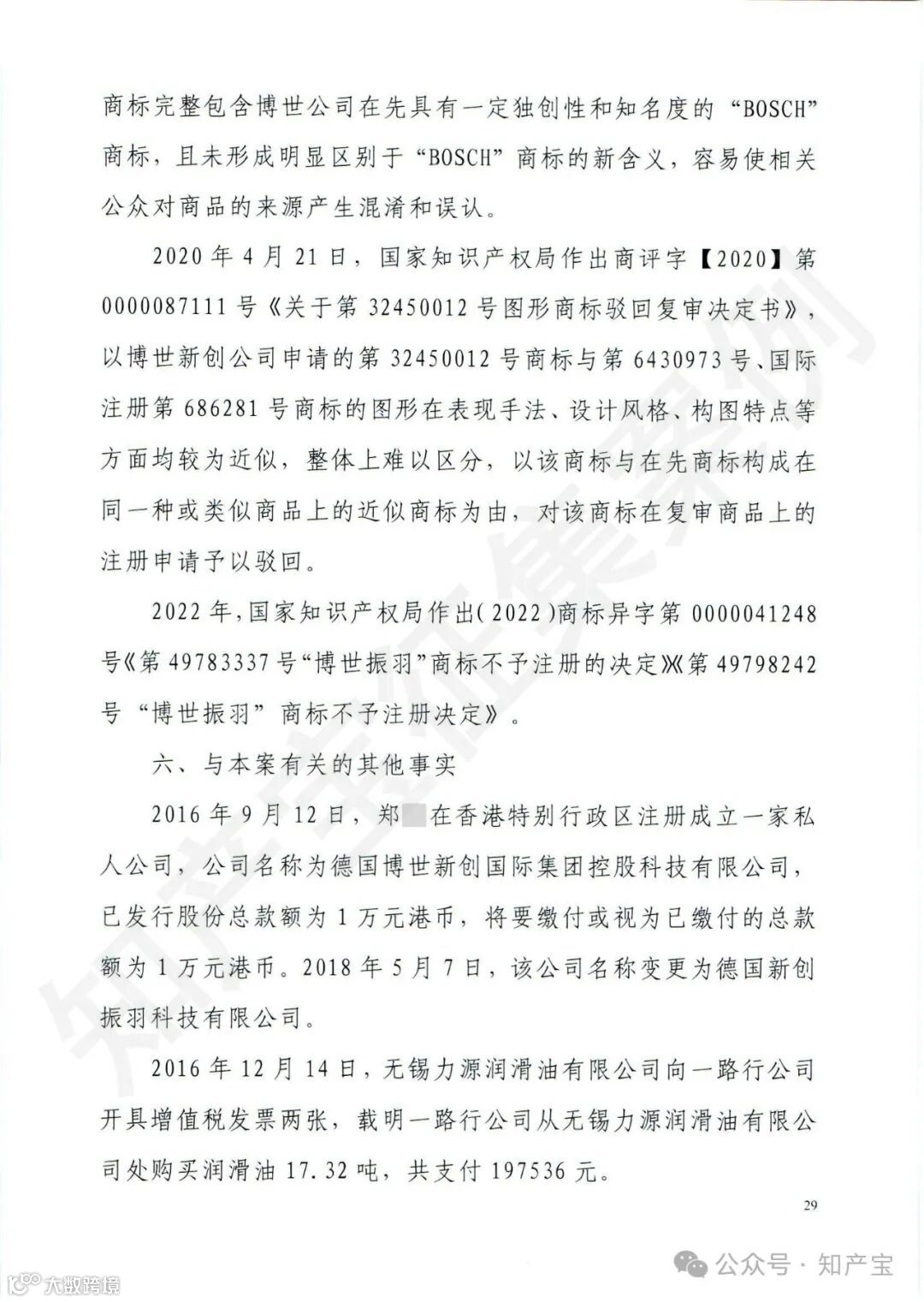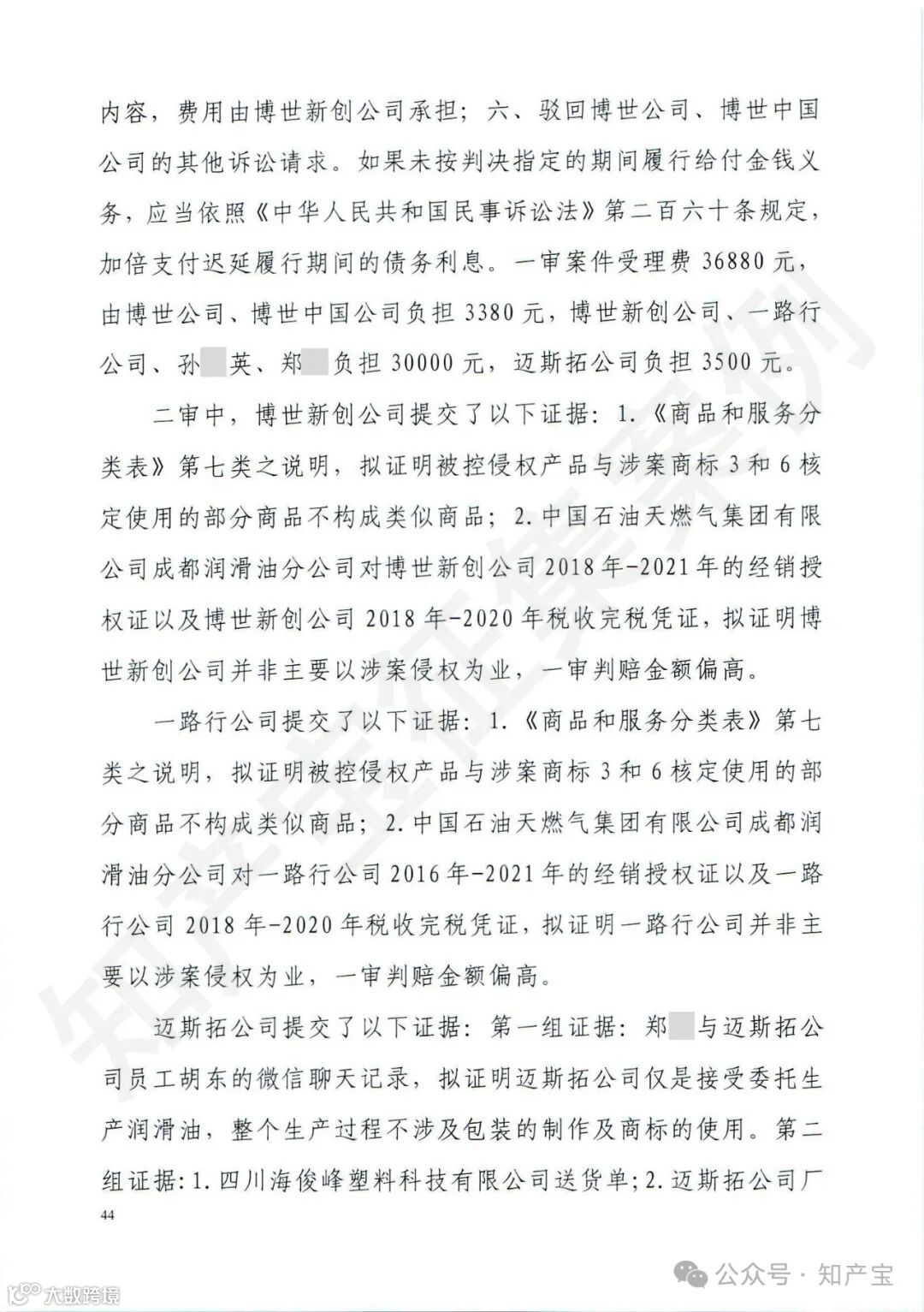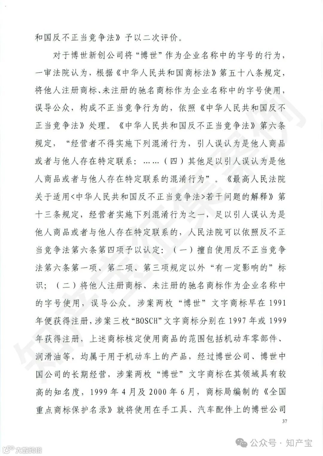 | 一审裁判结果 | 一、自判决生效之日起,博世新创公司、一路行公司、郑*、孙*英立即停止在其生产的产品以及在招商手册上使用侵害博世公司、博世中国公司第 G686280号“BOSCH”、第 959140号“BOSCH”、第1329333号“BOSCH”、第G686281号 547473号 、第548613号 注册商标专用权的行为,以及停止在产品上使用“德国博世新创国际集团控股科技有限公司”“四川博世新创贸易有限公司”的字样,同时停止销售上述侵权产品;二、自判决生效之日起十五日内,博世新创公司、一路行公司、孙*英、郑*共同赔偿博世公司、博世中国公司经济损失300万元,迈斯拓公司对前述赔偿金额在15万元范围内承担连带责任; 三、自判决生效之日起十五日内,博世新创公司、一路行公司、孙*英、郑*向博世公司、博世中国公司支付本案合理开支费用 10万元; 四、自判决生效之日起,博世新创公司立即停止使用含有“博世”字样的企业名称; 五、自判决生效之日起十五日内,博世新创公司在《法制日报》上刊登声明以消除影响(内容需经一审法院审核);若博世新创公司逾期不履行,博世公司、博世中国公司可以申请一审法院刊登判决的主要内容,费用由博世新创公司承担; 六、驳回博世公司、博世中国公司的其他诉讼请求。 |