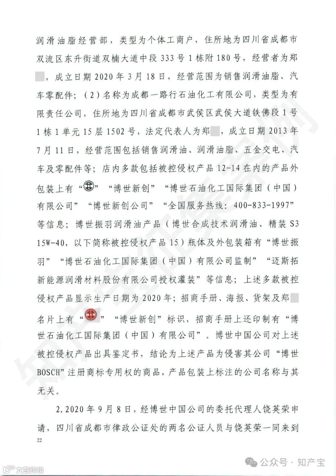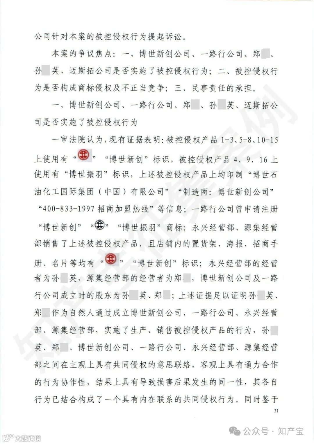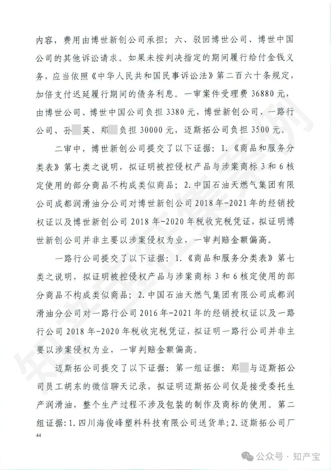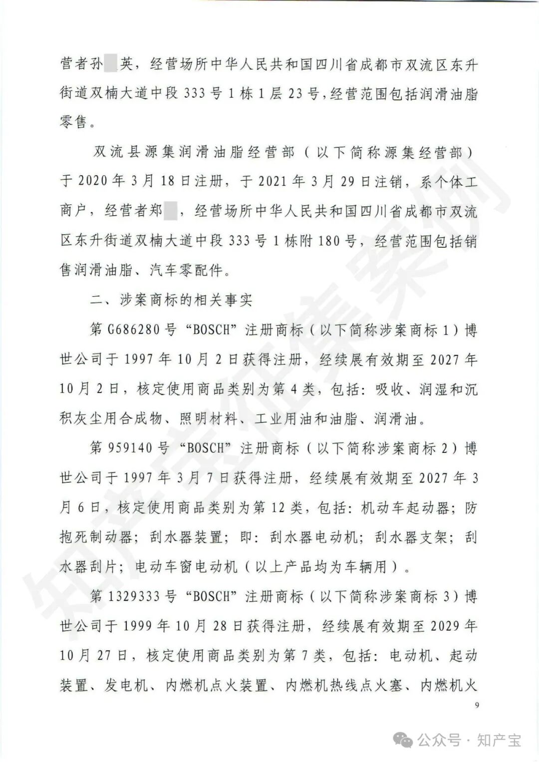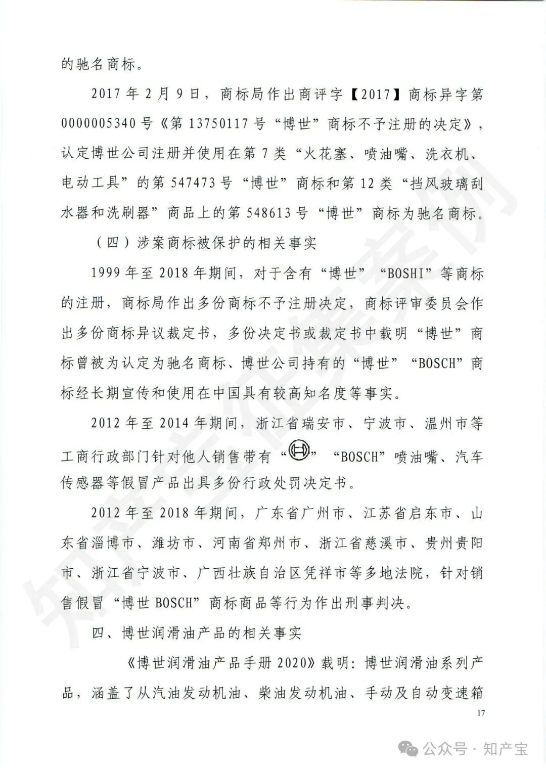 | 一审裁判结果 | 一、自判决生效之日起,博世新创公司、一路行公司、郑*、孙*英立即停止在其生产的产品以及在招商手册上使用侵害博世公司、博世中国公司第 G686280号“BOSCH”、第 959140号“BOSCH”、第1329333号“BOSCH”、第G686281号 547473号 、第548613号 注册商标专用权的行为,以及停止在产品上使用“德国博世新创国际集团控股科技有限公司”“四川博世新创贸易有限公司”的字样,同时停止销售上述侵权产品;二、自判决生效之日起十五日内,博世新创公司、一路行公司、孙*英、郑*共同赔偿博世公司、博世中国公司经济损失300万元,迈斯拓公司对前述赔偿金额在15万元范围内承担连带责任; 三、自判决生效之日起十五日内,博世新创公司、一路行公司、孙*英、郑*向博世公司、博世中国公司支付本案合理开支费用 10万元; 四、自判决生效之日起,博世新创公司立即停止使用含有“博世”字样的企业名称; 五、自判决生效之日起十五日内,博世新创公司在《法制日报》上刊登声明以消除影响(内容需经一审法院审核);若博世新创公司逾期不履行,博世公司、博世中国公司可以申请一审法院刊登判决的主要内容,费用由博世新创公司承担; 六、驳回博世公司、博世中国公司的其他诉讼请求。 |