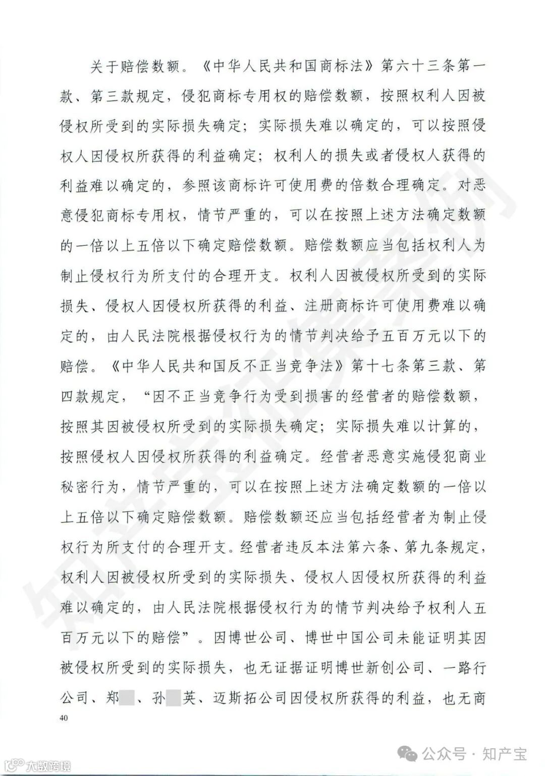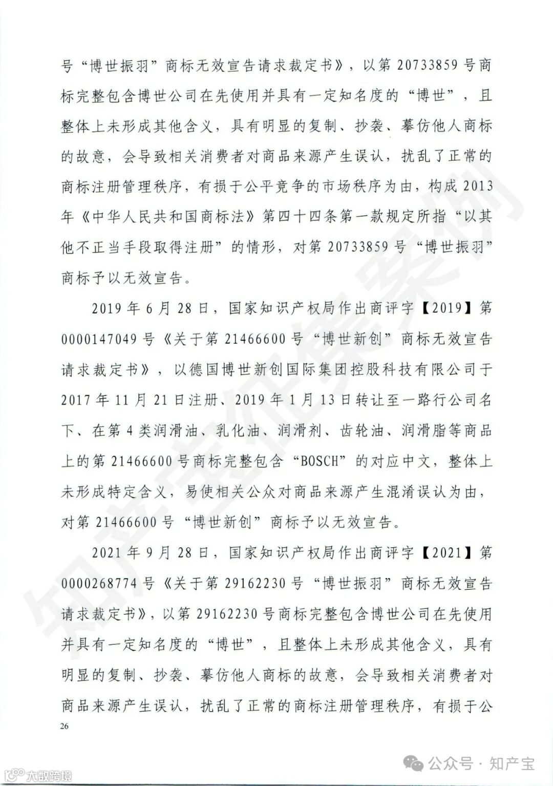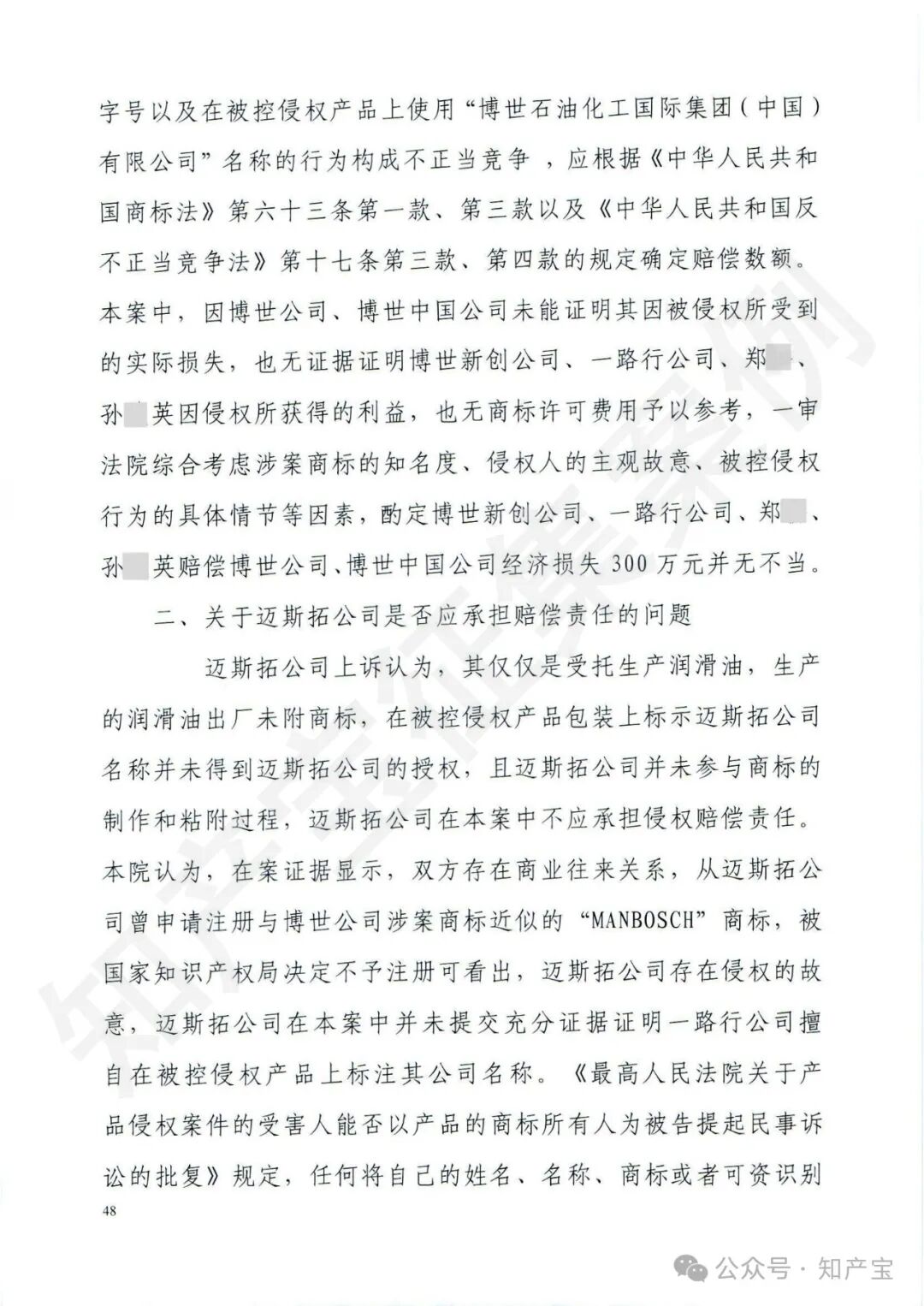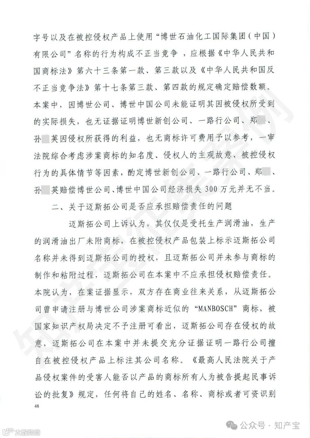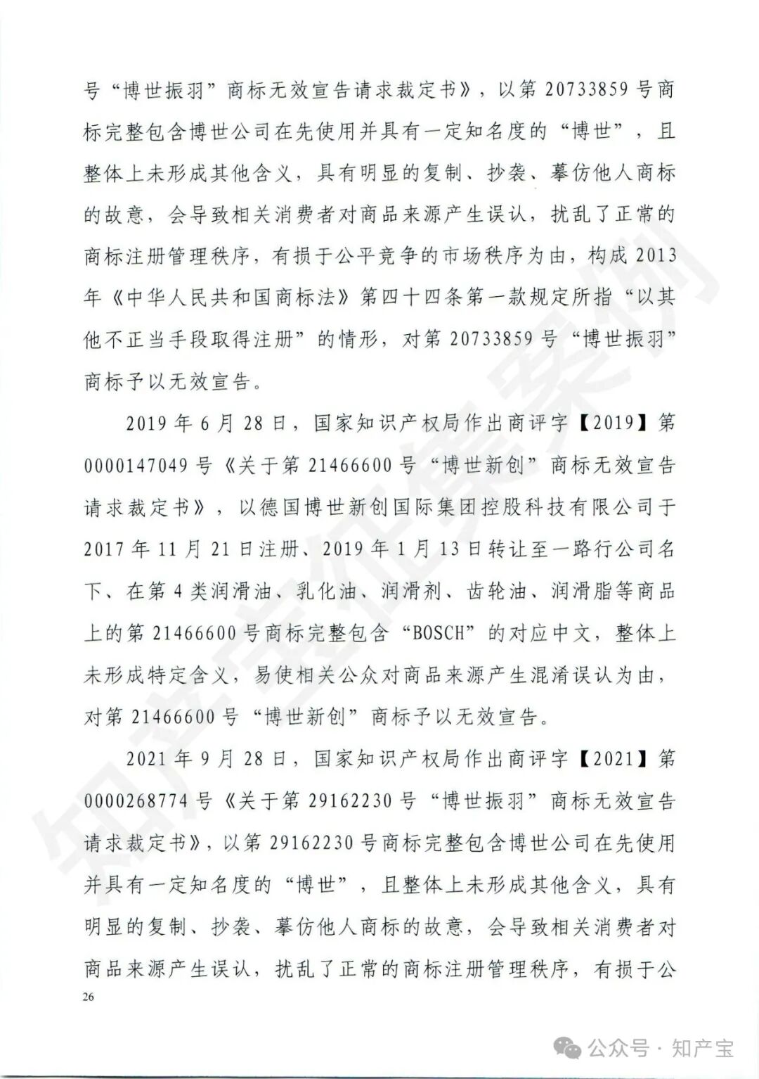 | 一审裁判结果 | 一、自判决生效之日起,博世新创公司、一路行公司、郑*、孙*英立即停止在其生产的产品以及在招商手册上使用侵害博世公司、博世中国公司第 G686280号“BOSCH”、第 959140号“BOSCH”、第1329333号“BOSCH”、第G686281号 547473号 、第548613号 注册商标专用权的行为,以及停止在产品上使用“德国博世新创国际集团控股科技有限公司”“四川博世新创贸易有限公司”的字样,同时停止销售上述侵权产品;二、自判决生效之日起十五日内,博世新创公司、一路行公司、孙*英、郑*共同赔偿博世公司、博世中国公司经济损失300万元,迈斯拓公司对前述赔偿金额在15万元范围内承担连带责任; 三、自判决生效之日起十五日内,博世新创公司、一路行公司、孙*英、郑*向博世公司、博世中国公司支付本案合理开支费用 10万元; 四、自判决生效之日起,博世新创公司立即停止使用含有“博世”字样的企业名称; 五、自判决生效之日起十五日内,博世新创公司在《法制日报》上刊登声明以消除影响(内容需经一审法院审核);若博世新创公司逾期不履行,博世公司、博世中国公司可以申请一审法院刊登判决的主要内容,费用由博世新创公司承担; 六、驳回博世公司、博世中国公司的其他诉讼请求。 |