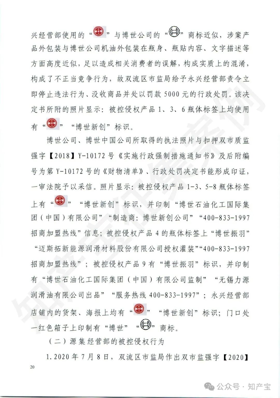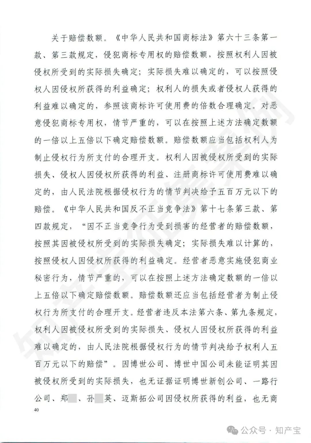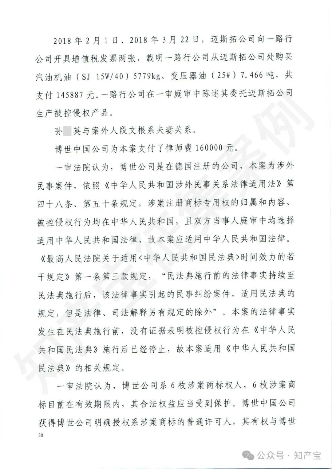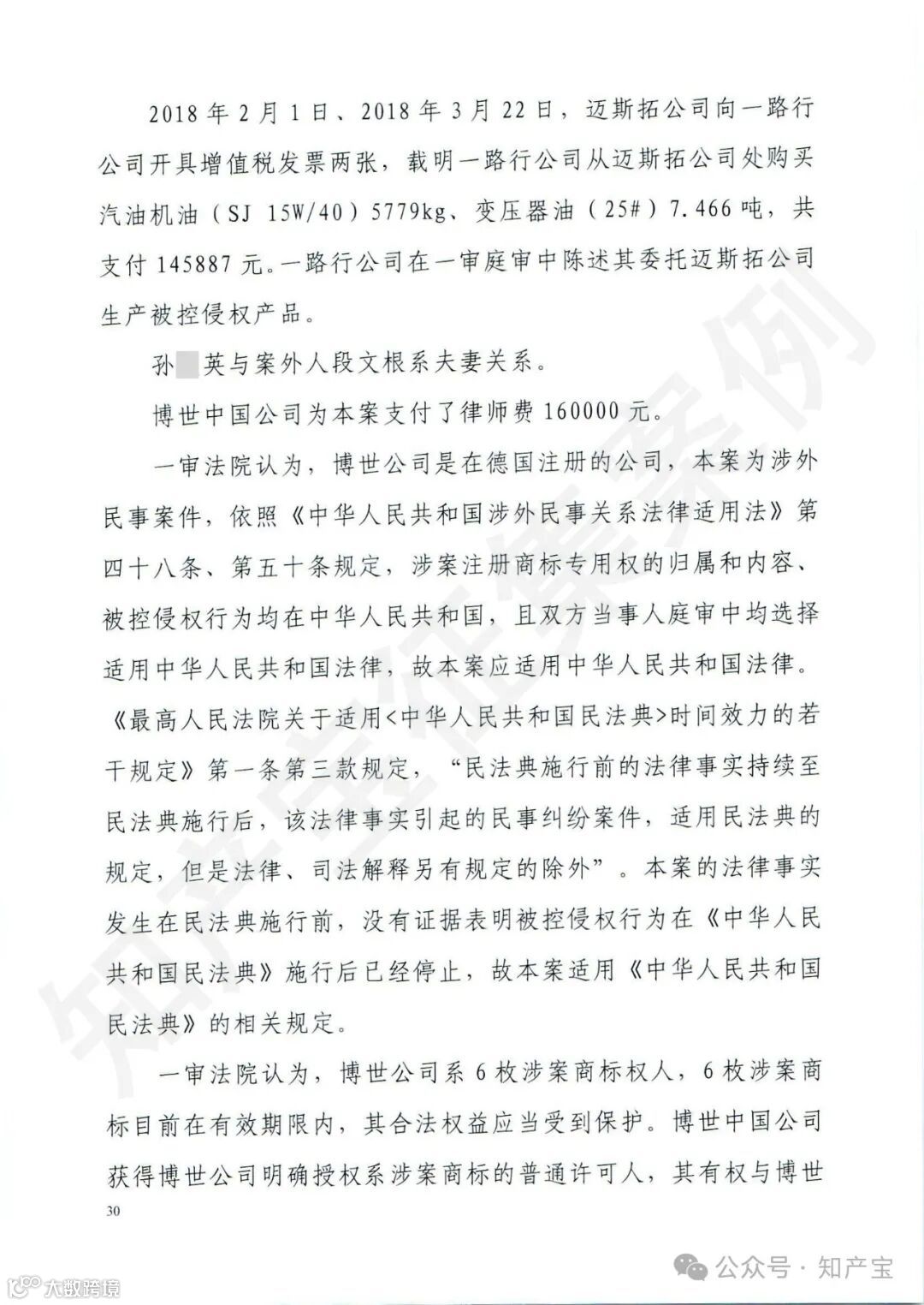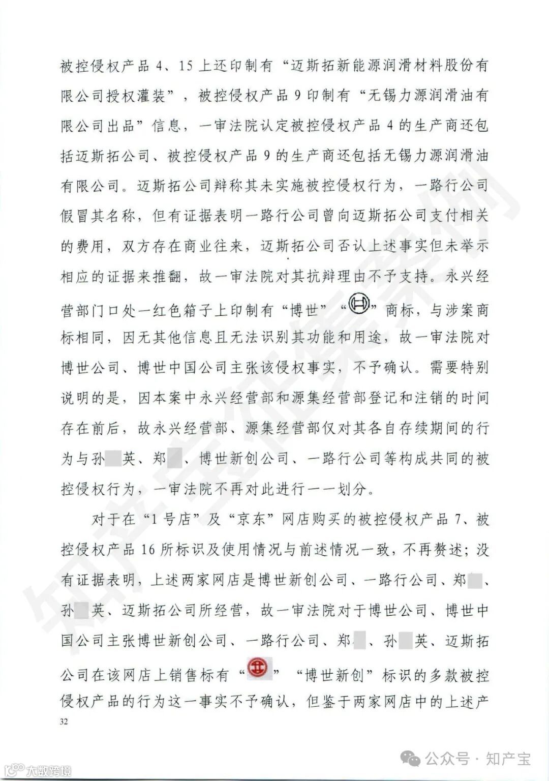 | 一审裁判结果 | 一、自判决生效之日起,博世新创公司、一路行公司、郑*、孙*英立即停止在其生产的产品以及在招商手册上使用侵害博世公司、博世中国公司第 G686280号“BOSCH”、第 959140号“BOSCH”、第1329333号“BOSCH”、第G686281号 547473号 、第548613号 注册商标专用权的行为,以及停止在产品上使用“德国博世新创国际集团控股科技有限公司”“四川博世新创贸易有限公司”的字样,同时停止销售上述侵权产品;二、自判决生效之日起十五日内,博世新创公司、一路行公司、孙*英、郑*共同赔偿博世公司、博世中国公司经济损失300万元,迈斯拓公司对前述赔偿金额在15万元范围内承担连带责任; 三、自判决生效之日起十五日内,博世新创公司、一路行公司、孙*英、郑*向博世公司、博世中国公司支付本案合理开支费用 10万元; 四、自判决生效之日起,博世新创公司立即停止使用含有“博世”字样的企业名称; 五、自判决生效之日起十五日内,博世新创公司在《法制日报》上刊登声明以消除影响(内容需经一审法院审核);若博世新创公司逾期不履行,博世公司、博世中国公司可以申请一审法院刊登判决的主要内容,费用由博世新创公司承担; 六、驳回博世公司、博世中国公司的其他诉讼请求。 |