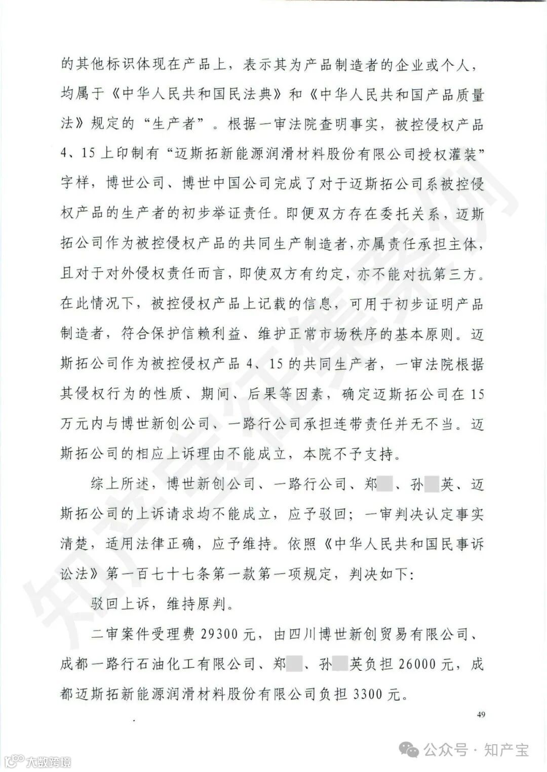 任何在产品上标示自己名称、商标或其他可识别标识,表示其为产品制造者的企业或个人,均属于产品生产者。本案中,尽管迈斯拓公司主张其只是受托生产,且未授权在产品上标示其名称,但证据显示其与被控侵权产品存在关联。即便存在委托关系,迈斯拓公司作为被控侵权产品的共同生产者,亦应承担责任。一审法院根据迈斯拓公司侵权行为的性质、期间、后果等因素,确定其在15万元内与博世新创公司、一路行公司承担连带责任是合理的。
