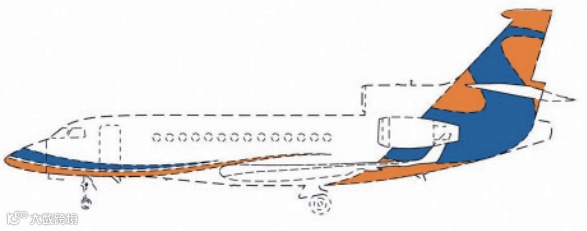 该商标为颜色商标。该颜色组合商标由橙色和蓝色两种颜色组合构成。其中橙色为 Pantone 1375C, 蓝色为 Pantone 300C。橙色和蓝色分别用于飞机头部和尾翼。虚线部分用以表示颜色在该商品上的位置,飞机外廓和外形不是商标构成要素。