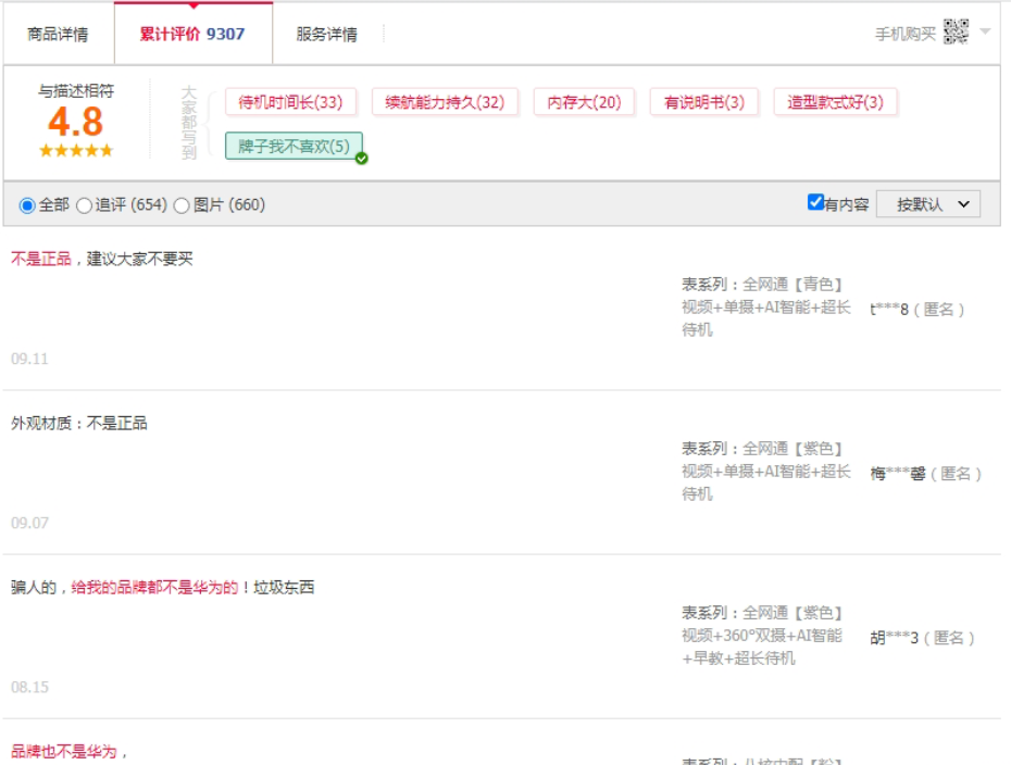 谁知收到产品后,王女士发现该产品并非华为电话手表,而是一个从未听说过的品牌。王女士百思不得其解,自己明明买的是“官方正品”,怎么李逵变成了李鬼呢?