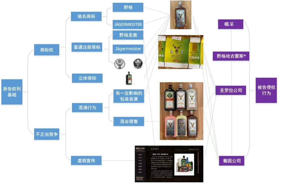 原告发现,被告圣罗拉公司在其生产和销售的利口酒酒瓶标签、瓶盖上使用了“野格哈古雷斯”“鹿头图形”“YEGO HUNTER”等标识,在其官网上使用“野格哈古雷斯”“野格”“野格守猎者”等商标,侵犯了原告的注册商标专用权。被告圣罗拉公司使用了与原告有一定影响的包装装潢相同或者近似的包装装潢,使用“德国野格圣鹿集团有限公司”的名义,引人误认为被控侵权产品是原告商品或与原告存在特定联系,构成不正当竞争。而三被告则主张其使用的系其自有注册商标,即被告唱某注册的第31027236号“野格哈古雷斯”商标,并未侵犯原告商标权。