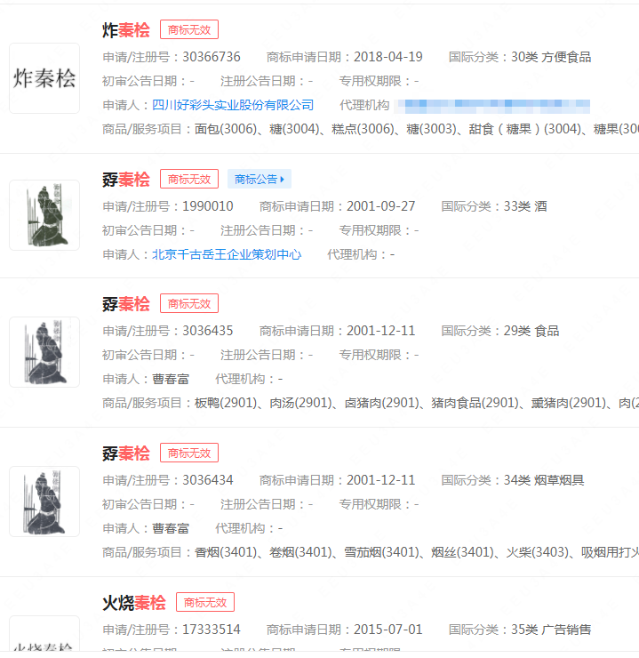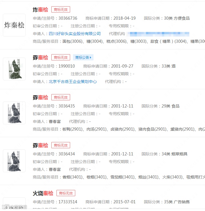 据企查查显示,其实,曾有多家公司以及自然人申请“秦桧”相关商标,包括“孬秦桧”“炸秦桧”“火烧秦桧”“秦桧跪岳”等,国际分类包括方便食品、烟草烟具、广告销售等,这些商标最早申请于2001年,目前均被驳回或处于无效状态。